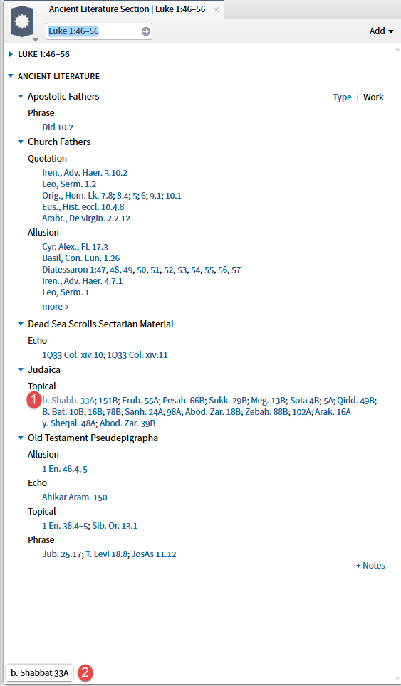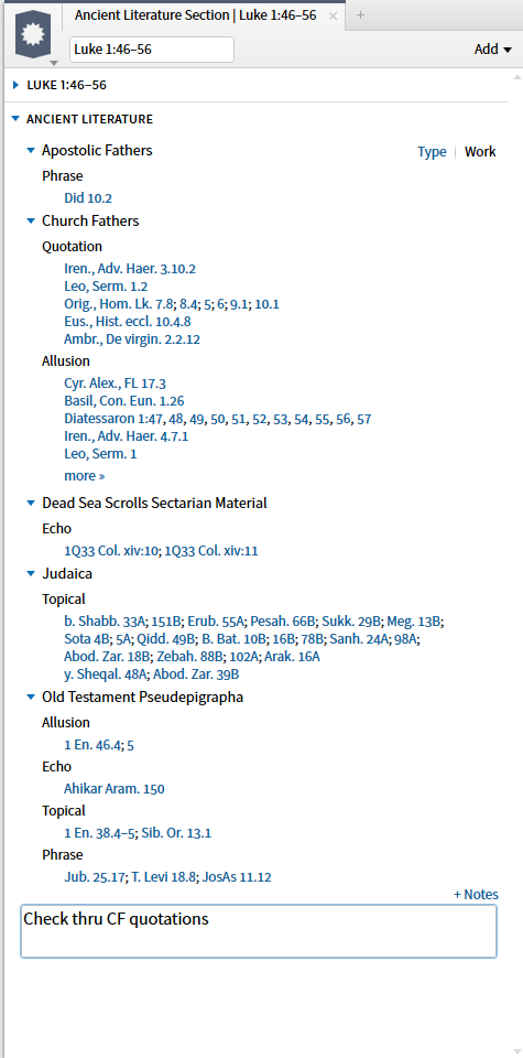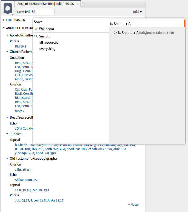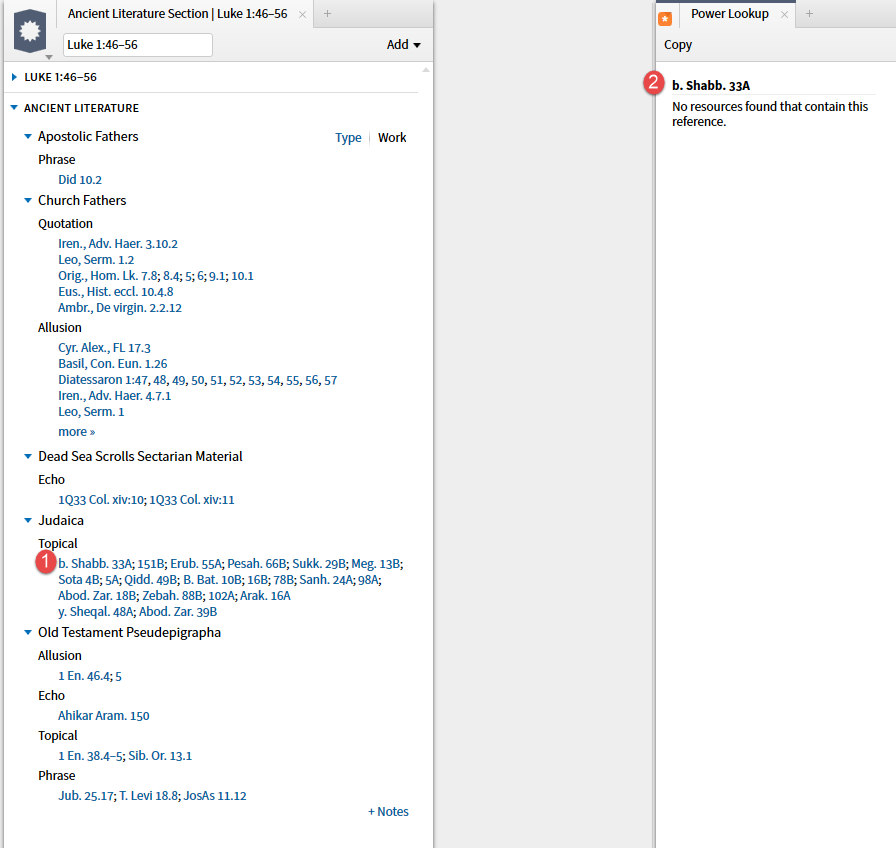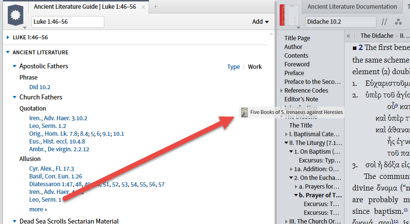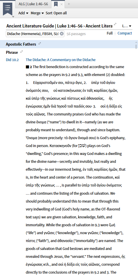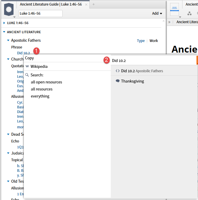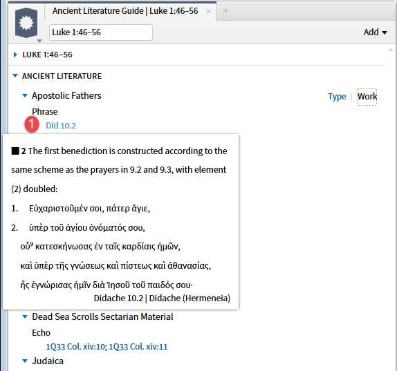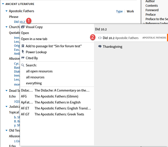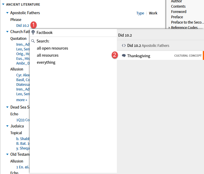 When the second option, Apostolic Fathers datatype, is selected the resources (top 5 by priority) you own containing the reference are shown. (I have requested a Facebook link be added here which would require the expansion of Factbook.)