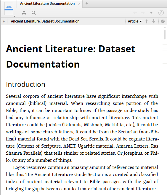 IV. The dataset is documented in Brannan, Rick. Ancient Literature Documentation. Bellingham, WA: Faithlife, 2015. This documentation provides useful information: