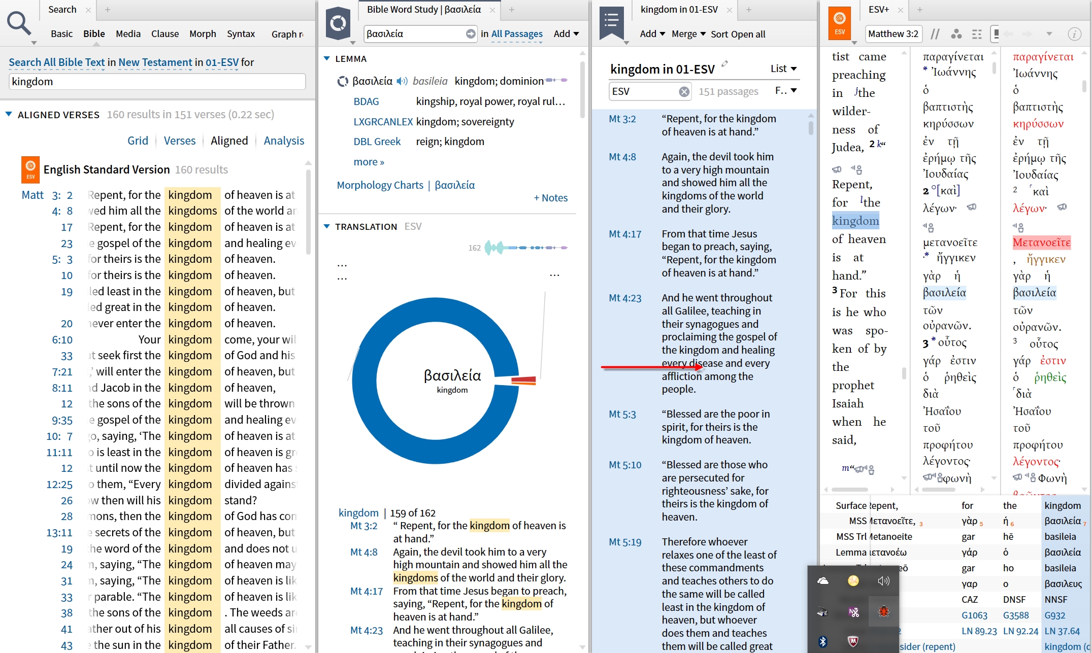 With all the new tagging and sense tagging, etc., in Logos 7 I was wondering if anyone knew of a way to do a Bible search - Old and/or New (but specifically the New) Testaments on verses on the Kingdom of God. I know I can start off with "Kingdom of God" OR "Kingdom of Heaven" but I know I would still miss many verses. If I just do Kingdom I get a lot of extra verses. Any suggestions?