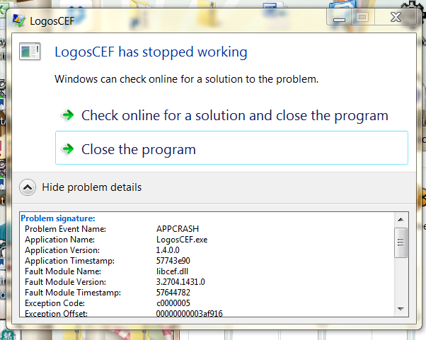 It would be helpful to have the logoscef.log, as well as any crash logs from the logging directory.