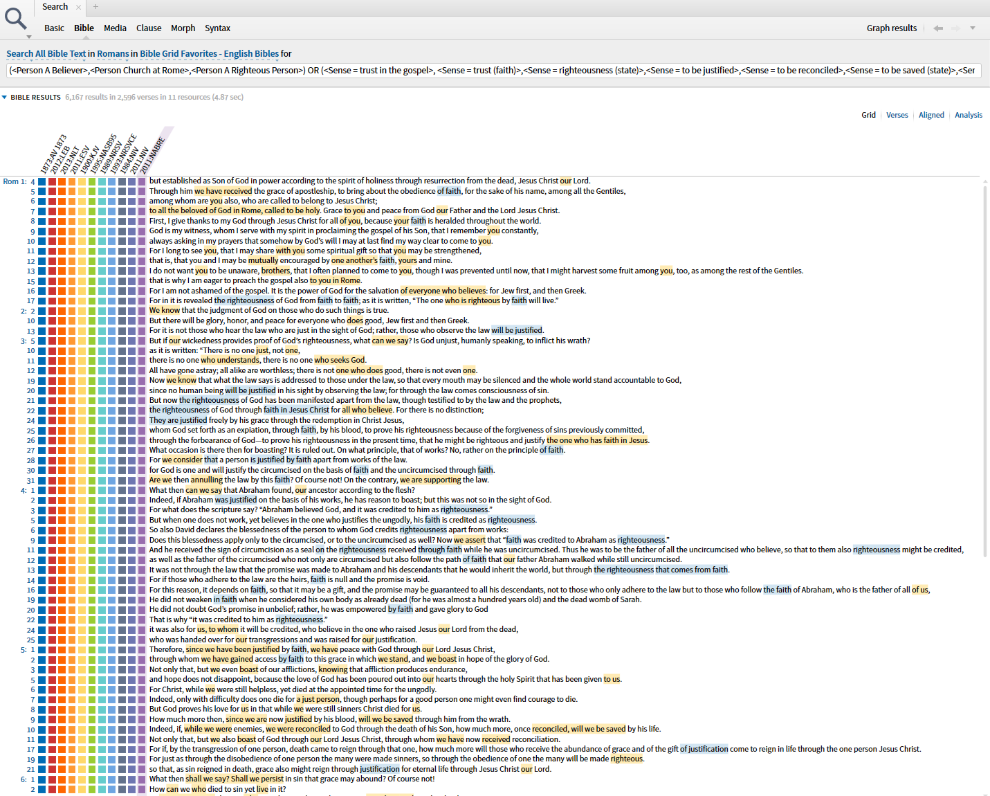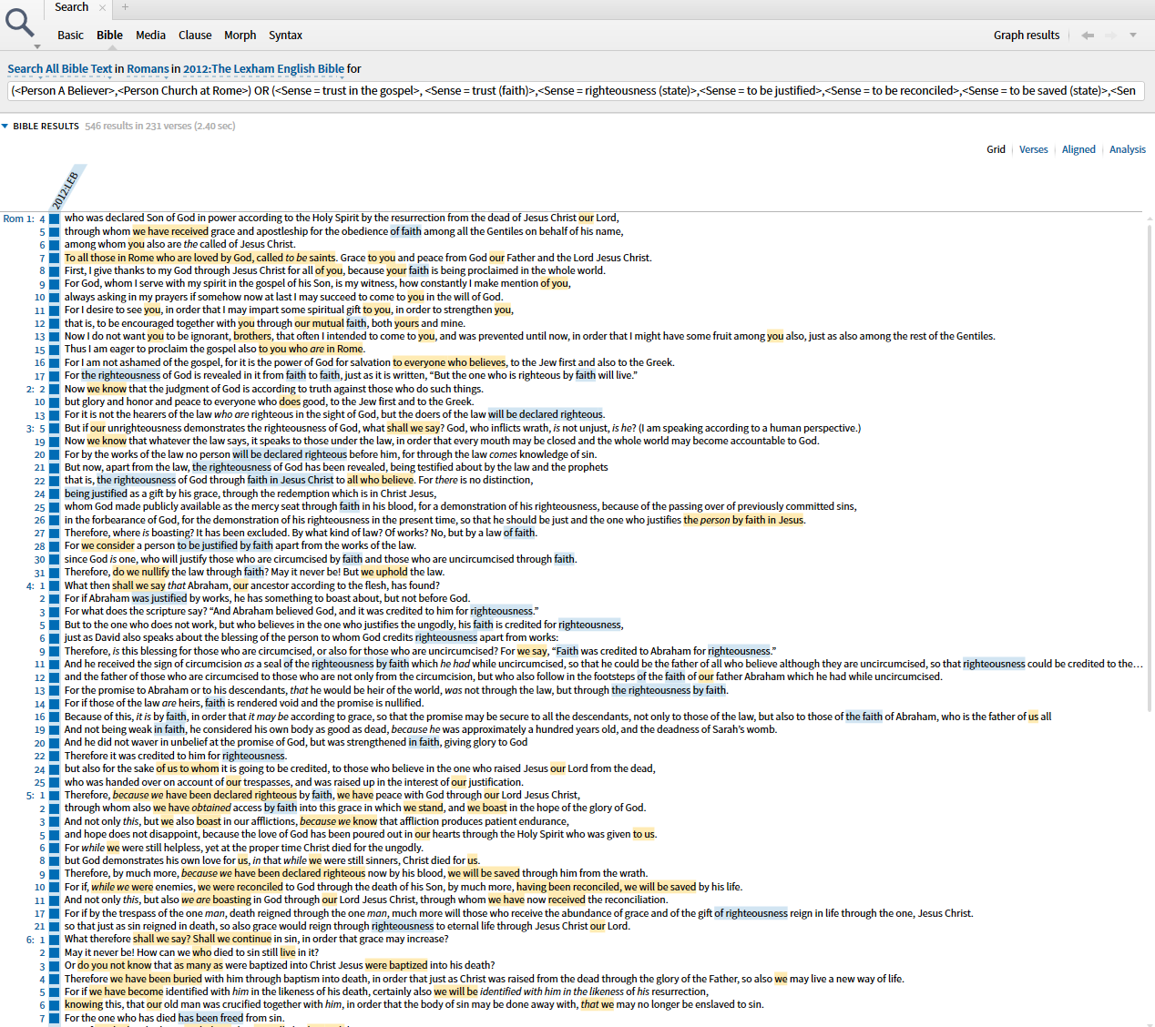 Again, exploring the context menu in a pertinent passage can give you ideas. (<Person A Believer>,<Person Church at Rome>) OR (<Sense = trust in the gospel>, <Sense = trust (faith)>,<Sense = righteousness (state)>,<Sense = to be justified>,<Sense = to be reconciled>,<Sense = to be saved (state)>,<Sense = to live>,<Sense = to be alive>,<Sense = to live together>)