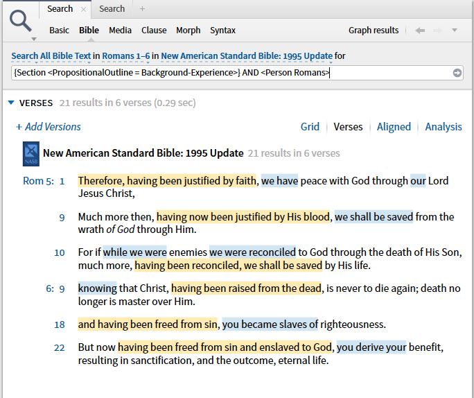 How would I do a search for every occurrence in Romans 1:1-6:11 either explicitly or implied that refers to our position in Christ or our new standing after becoming a believer?