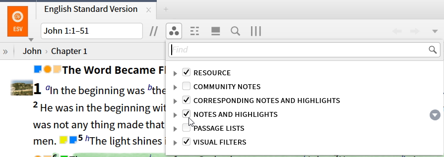 When I click filter section of my NASB Bible (or ESV...etc.) I only see the following main headings