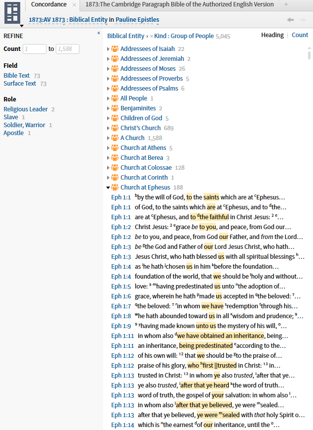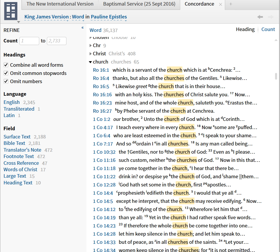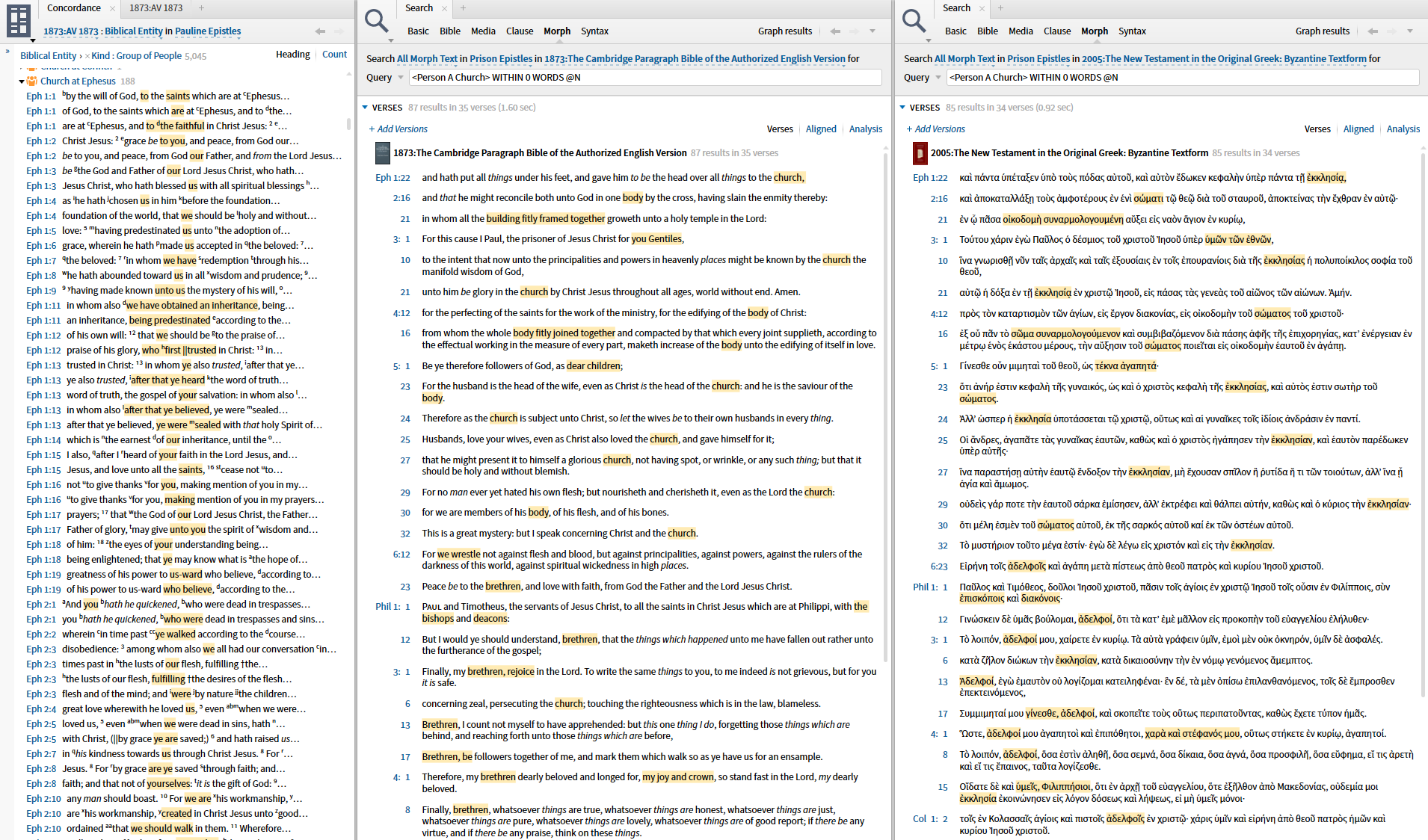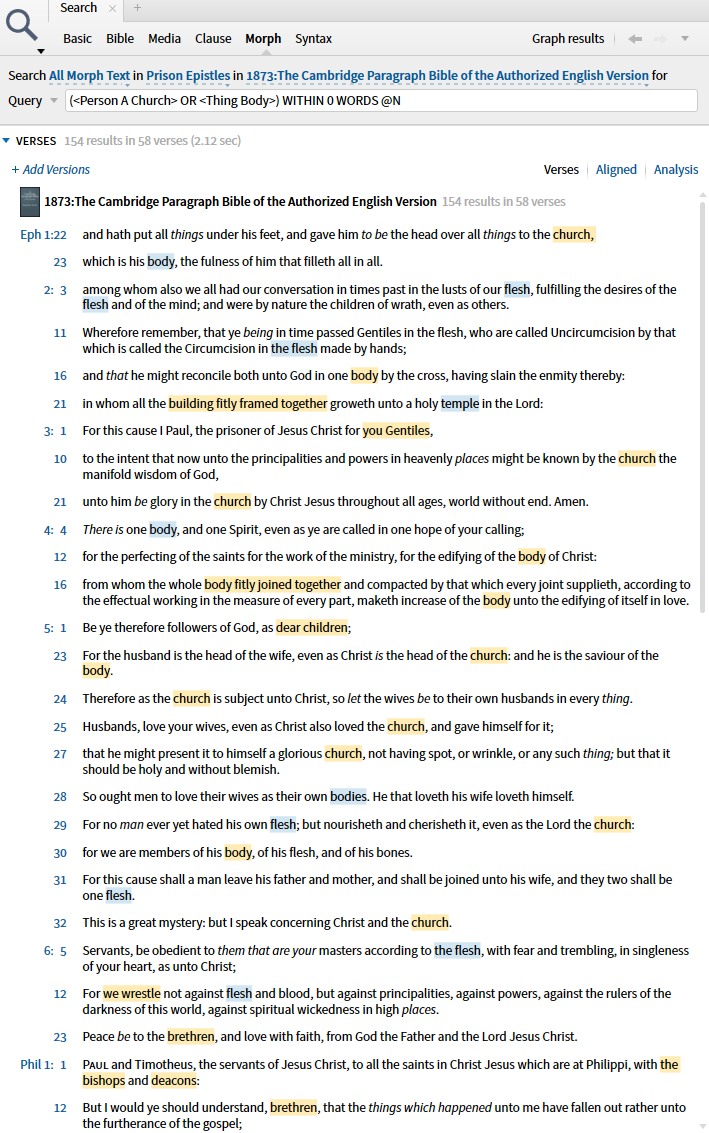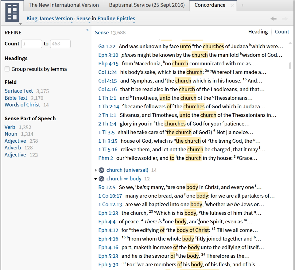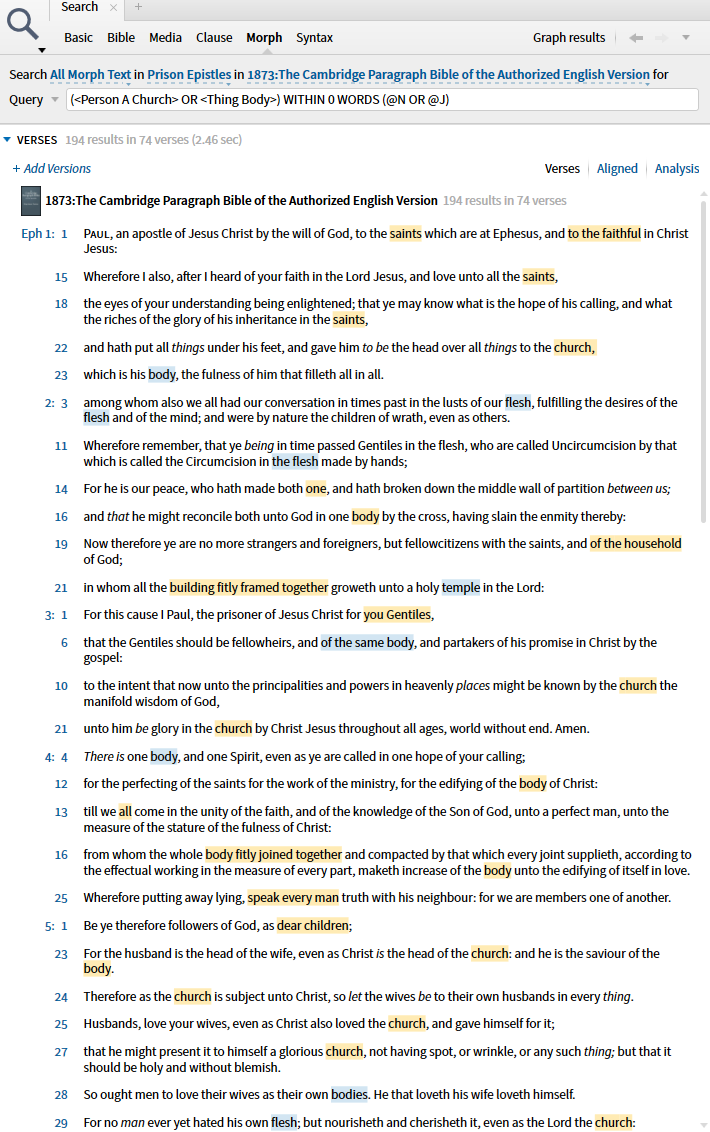 Using the new Logos 7 feature I tried to track down all the references to the Church in the Prison Epistles with the KJV as the bible of choice. I thought the new feature would work well since it ought to pick up synonyms such as "body" or "building" instead what it does is provide loads of references to matters outside the range of enquiry. It is not useful to get a list of all references to Christians in the epistles since involves a reference to virtually every verse - hence if I search under biblical entity for church wishing the range I get references to "us" "you" and some strange ones such as "fulfilling" , "making" :we should walk". Something wrong here. Surely the search should be concussed on the entity. Alan Summers