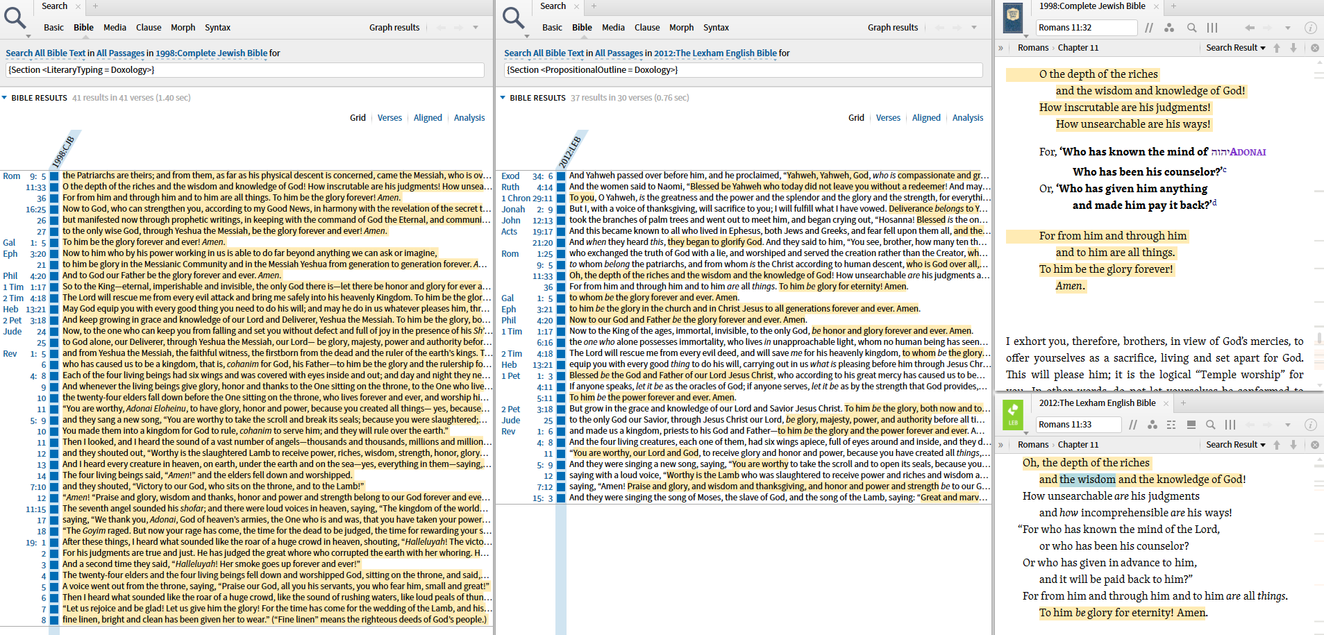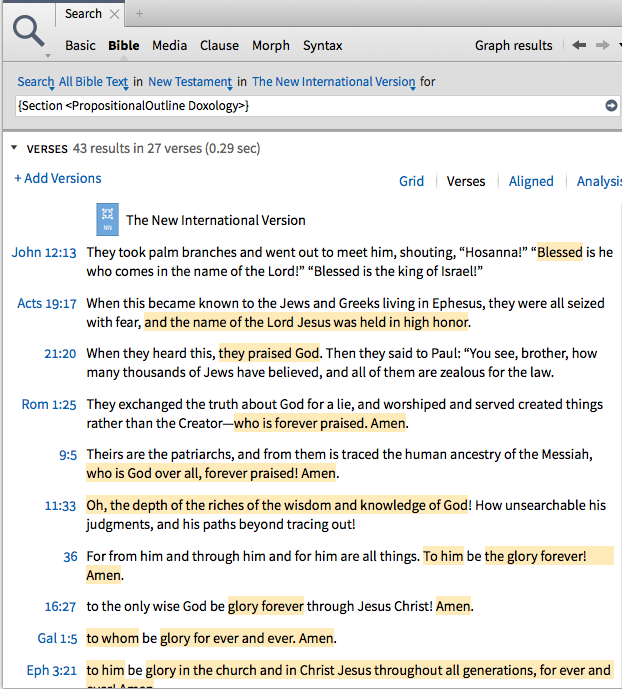 First, the answer: {Section <PropositionalOutline = Doxology>} in Bible search.