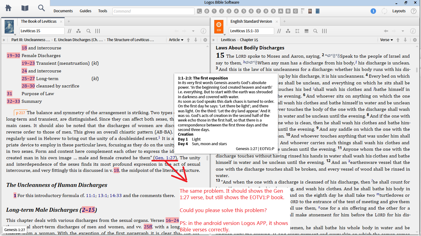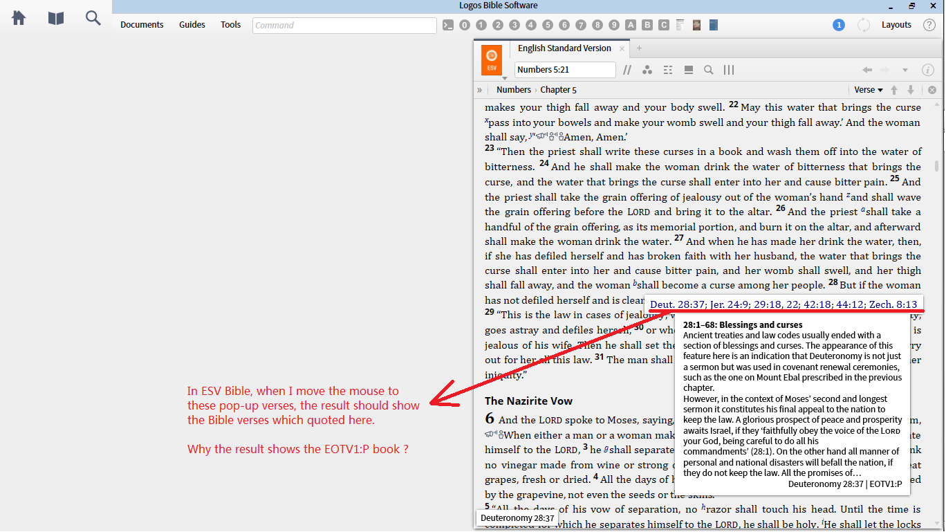 These I found my Logos 7 (PC) version cannot show the Bible verses correctly, only can show EOTV1 book info when I move mouse to the quoted bible verses there.