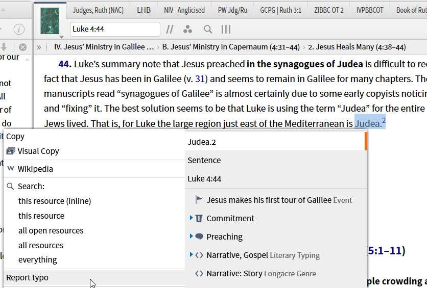 Perhaps it has changed in Logos 7, but before I could just underline the problem, right click, and then click on Report Typo and then could type in the correction. Right now I am working in Luke and am using the College Press commentary on Luke. On 4:44 the commentary included a footnote labeled 2 and it said "The writer of Hebrews makes the same observation (2:14–18; 4:15)." The hyperlink should be to Hebrews, but instead it is to Luke. However, I couldn't "report it," since the Report Typo was not there on the right click. Can someone tell me how we are now to report typos in Logos 7?