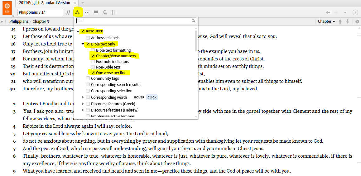 Is there a way, especially in interlinear Bibles, to start each verse at the left margin? It is somewhat difficult to find specific verses (especially with tri-focal glasses), when you have to skip over several lines and also differentiate between footnotes and word order subscripts.