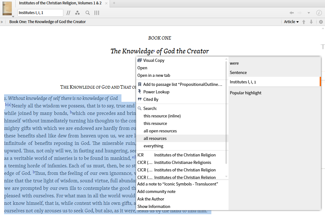 If the resource has location indexing: e.g. "Institutes of the Christian Religion", then right click shows location with search options and Top five resources with that indexing:
