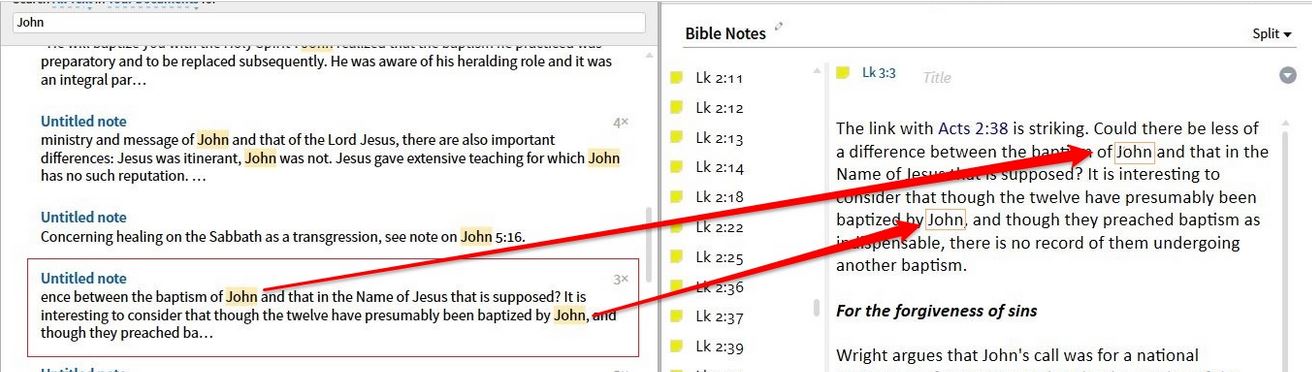 - The ability to click on the search terms in the search results and be taken exactly where the hit is in the user document (as is the case in resource searches). Alternatively, results could simply be highlighted in the user documents themselves, something like this: