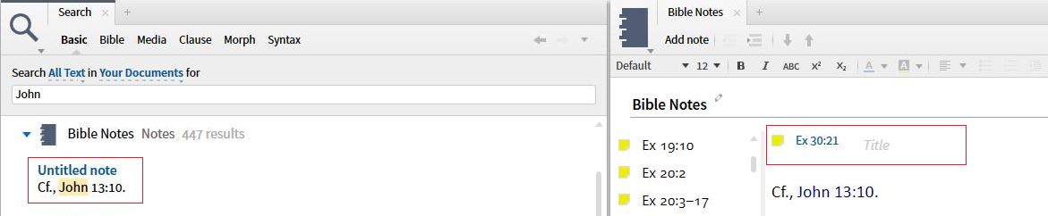 I have noticed that when I search my notes, each hit shows as under an "untitled note". Now this is quite technically correct since I do not usually give a title to my notes. Nevertheless, in the annotation window, the note name functions as title. In other words, a note created from John 3:1 shows as "John 3:1" even if I did not add a title nor want to.