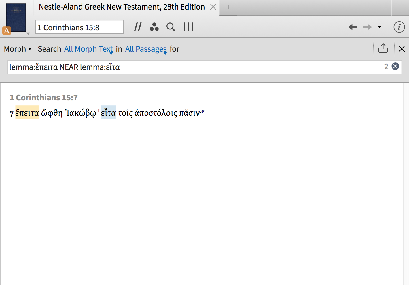 This search: lemma:ἔπειτα NEAR lemma:εἶτα should seem to return 1 Corinthians 15:23-24, but it doesn't: