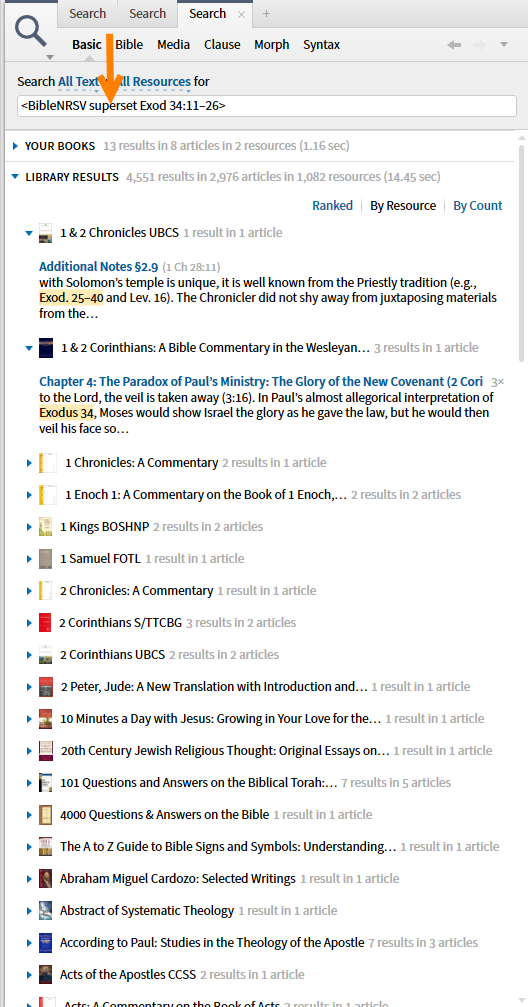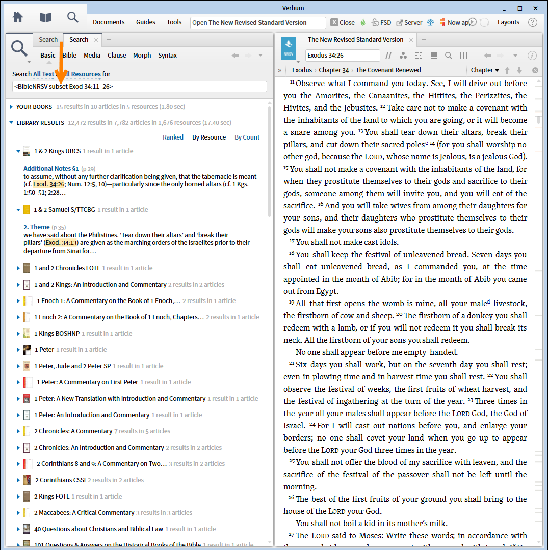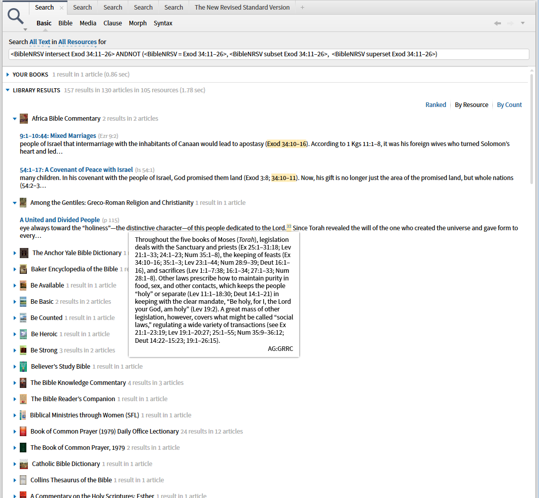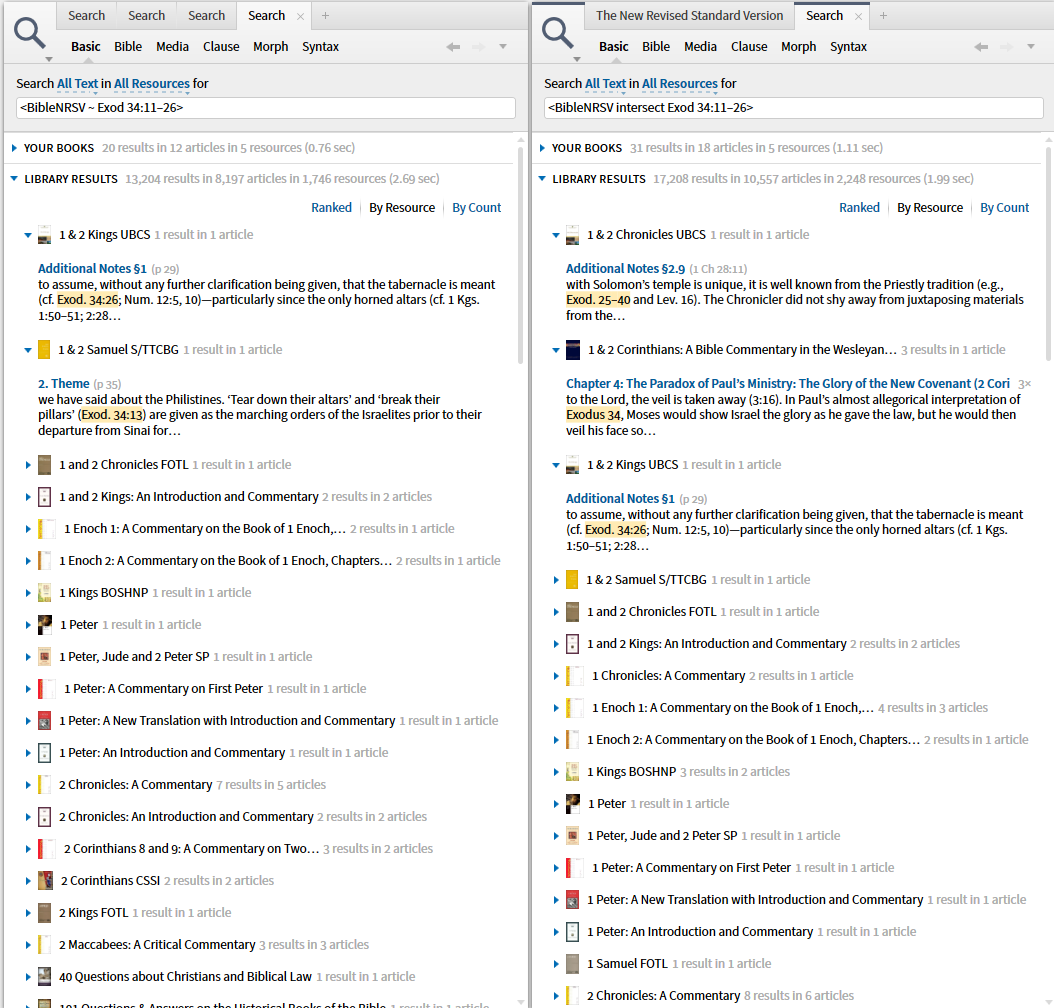 Take the most inclusive search argument <BibleNRSV intersect Exod 34:11–26> and subtract out (ANDNOT) the =, subset and superset results: <BibleNRSV intersect Exod 34:11–26> ANDNOT (<BibleNRSV = Exod 34:11–26>, <BibleNRSV subset Exod 34:11–26>, <BibleNRSV superset Exod 34:11–26>)