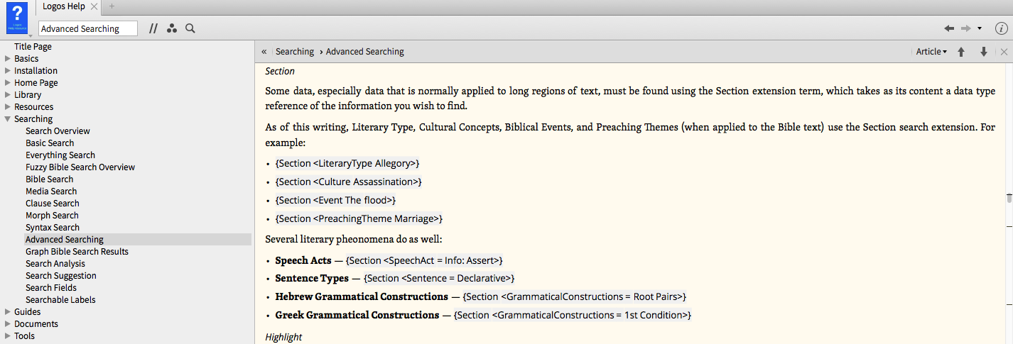 Thanks Bradley. Makes sense but needs documented at least in the wiki Done for https://wiki.logos.com/Search_HELP#Search_Extensions but also should be done in Logos/Verbum Help resources