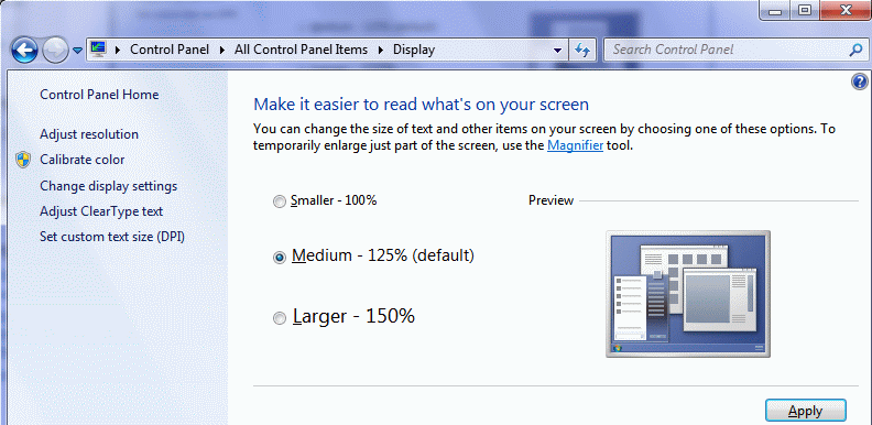 After getting my new Desktop computer with Windows 7 Pro I noticed the large text size of icons on the desktop and it looked like I had a resolution of 1024 x 768 when I had the monitor set to 1280 x 1024! It particularly affected the Library panel in L4. Further, I had run Windows 7 RC on the same monitor without this issue! So I blamed the video driver as I had read that some graphics cards had difficulties with the Direct2D graphics interface of Windows 7 vs the established GDI from XP and earlier Windows versions. But I remembered that I could adjust the DPI (dots per inch) in Windows, and a little Help got me to this:-