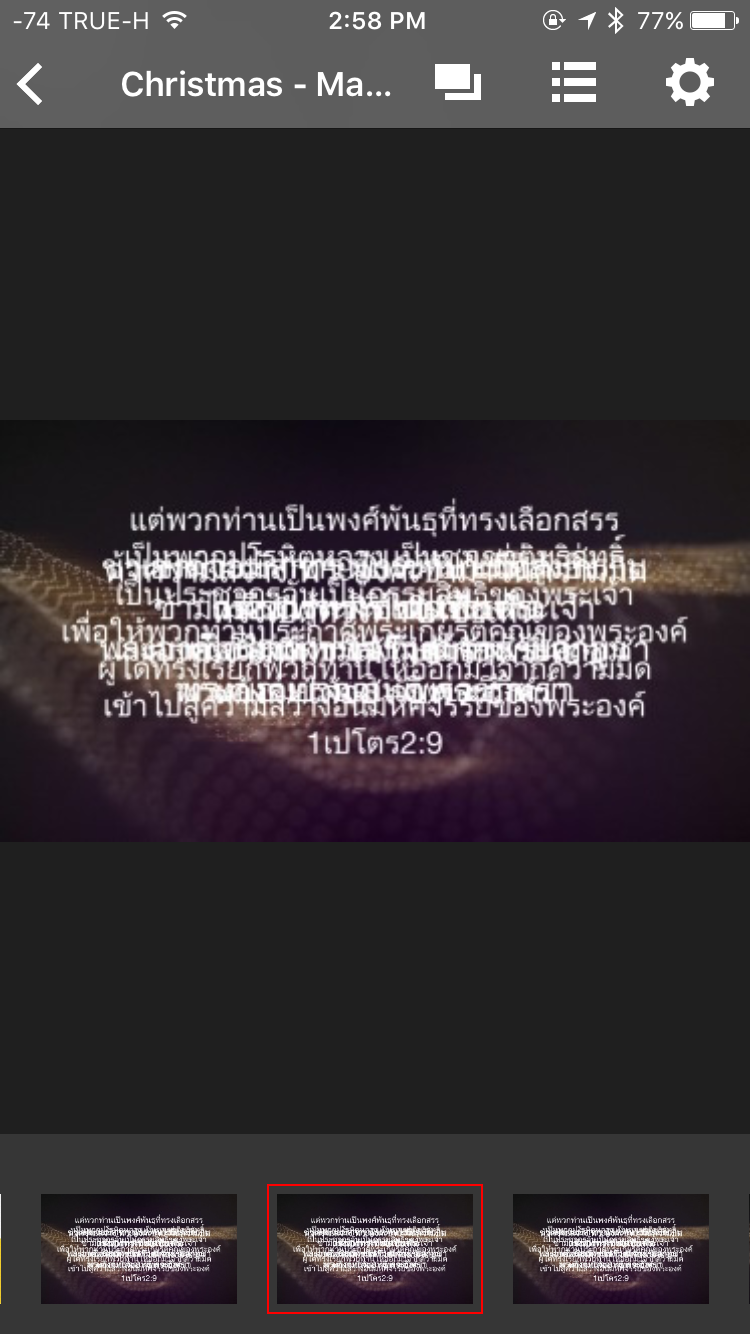 - The slide timeline view in the remote app is TOO TINY to be useful. I really liked the other way better on iOS. I can't read any text to see what I am switching too, its not even a very good overview (like a grid view would be), and since we do all our switching remotely, it made things kind of a mess for us since we end up switching to the wrong slide a lot, and can't find the right one without clicking through them all. I think there needs to be more options for how you want the remote to display. The confidence view helps with some text issues, but it is still inferior since I need to see the images too.