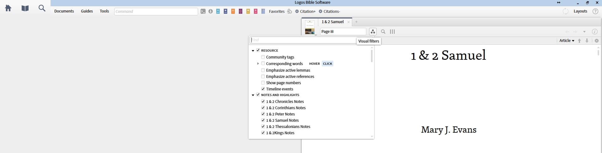 The visual filter is turned on: Notes & Highlights and General Notes are both checked off. As to what settings I use for note storage: hmmm. Now, I save in resource-specific. Then [2011], likely palette-specific. Would that make a difference re see / no see highlightings?