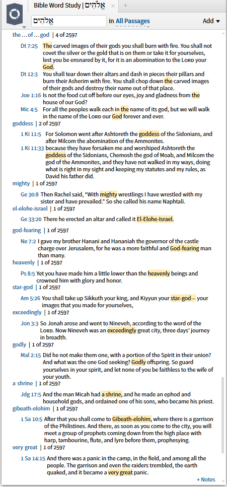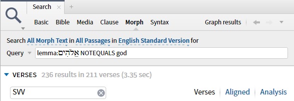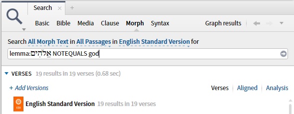 What I'm looking for is all instances where אלהים is NOT translated 'god' (or gods, or god's etc. of course). However, the second search includes 'gods' and 'god's' in its results. I also tried the string: lemma:אֱלֹהִים NOTEQUALS <Person God>, but this in fact showed at least 2000 results!!