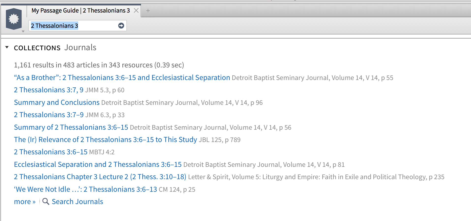 And to replicate what should appear in that section you can use the Basic Search string "{Label Journal Article WHERE References ~ <Bible 2 Thess 3>}"
