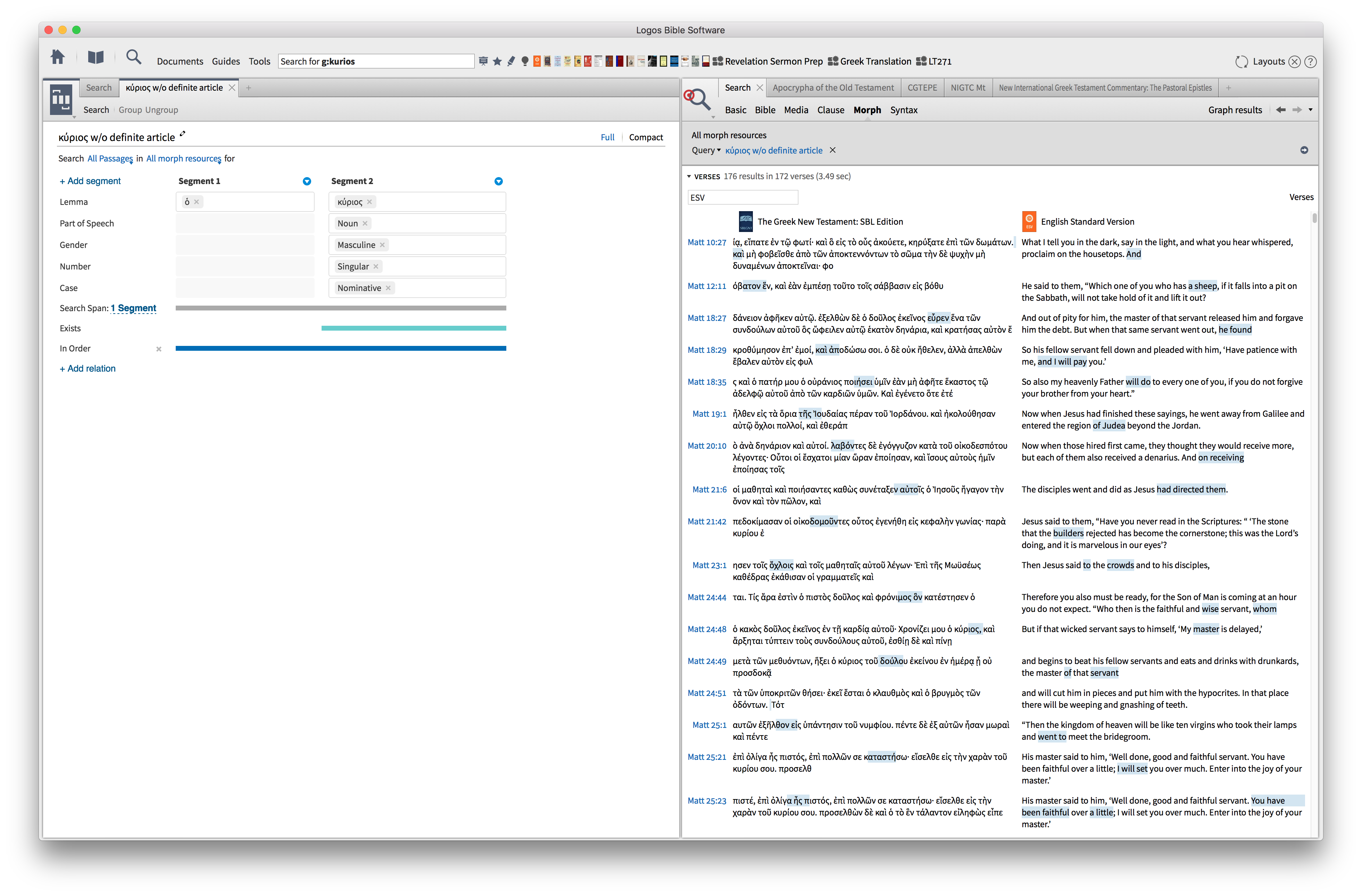 I'm interested in examining for myself what appears to be the divine name in NT. I am trying to find all instances of the Greek lemma κύριος in the nominative, masculine, singular without an article. I am yielding some unexpected results.