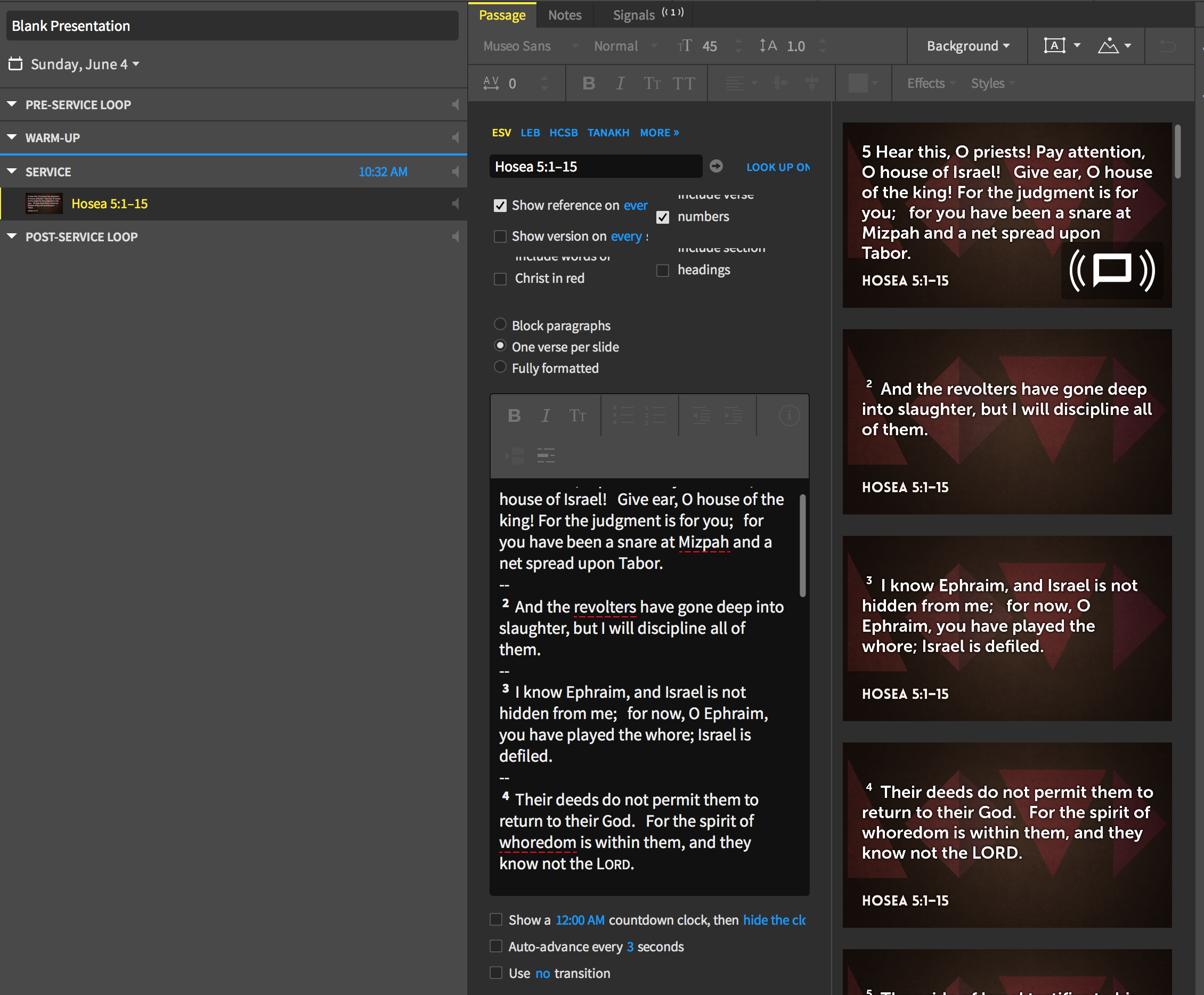 I'd like to have each verse on its own service item without manually creating each and every one, so I can insert things in between them, like this....
