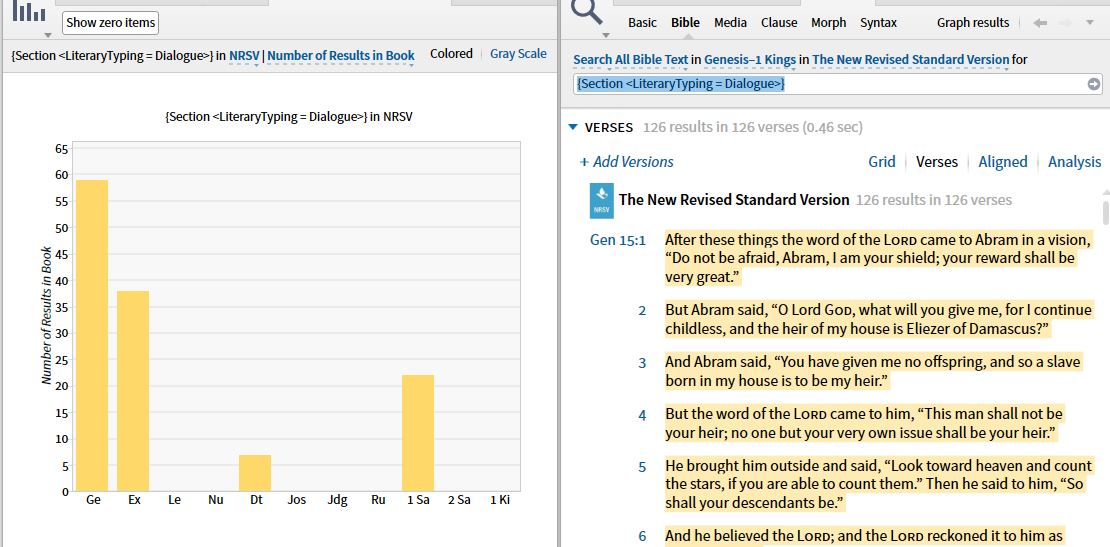 I was looking for dialogues using a literary types search today and got this (for Genesis - 1 Kings):