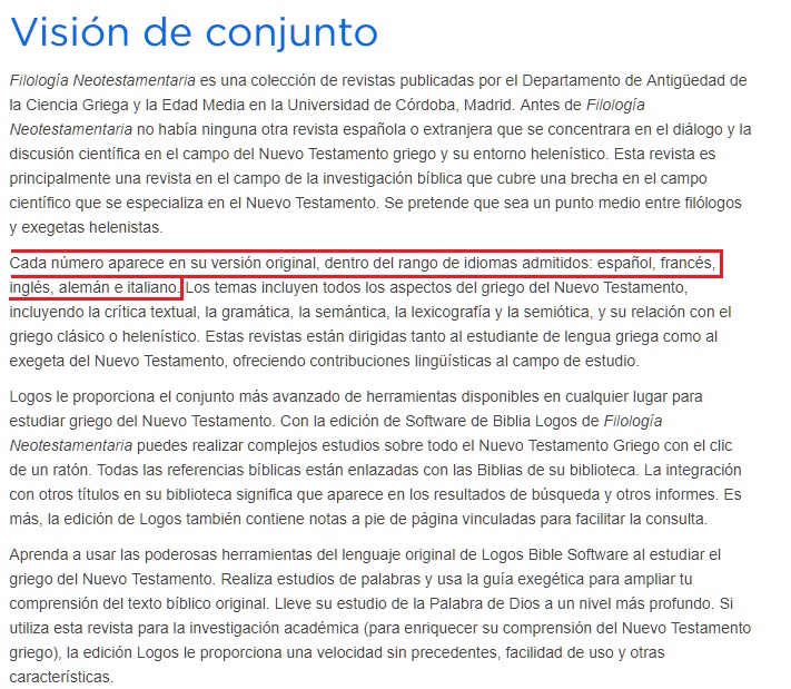 Mi consulta es la siguiente, alguien puede ayudarme y decirme si este recurso esta en español (https://www.logos.com/es/producto/15783/filologia-neotestamentaria) Si bien el titulo esta en español, toda la descripción esta en ingles, es por eso mi duda.