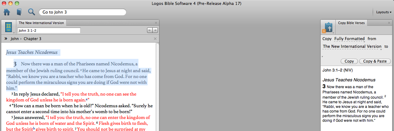 I love this feature when Copy and Paste... When you select your text and it appears in the Copy Bible Verses (whatever you select it appears in the copy bible verses field). Just like Logos 4 (PC/Windows)