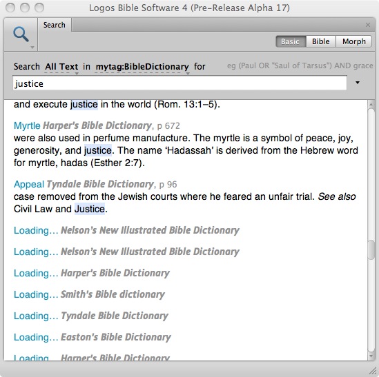 As I'm studying the story of Ahab and Naboth, I decided to search my Bible dictionaries for some more info on the justice of God. Having already tagged them, this is rather easy to do with L4's search. However, after I scrolled down about 20 lines or so, I noticed something interesting: Some items were "loading...", and they perpetually stayed in this state of unfinishedness: