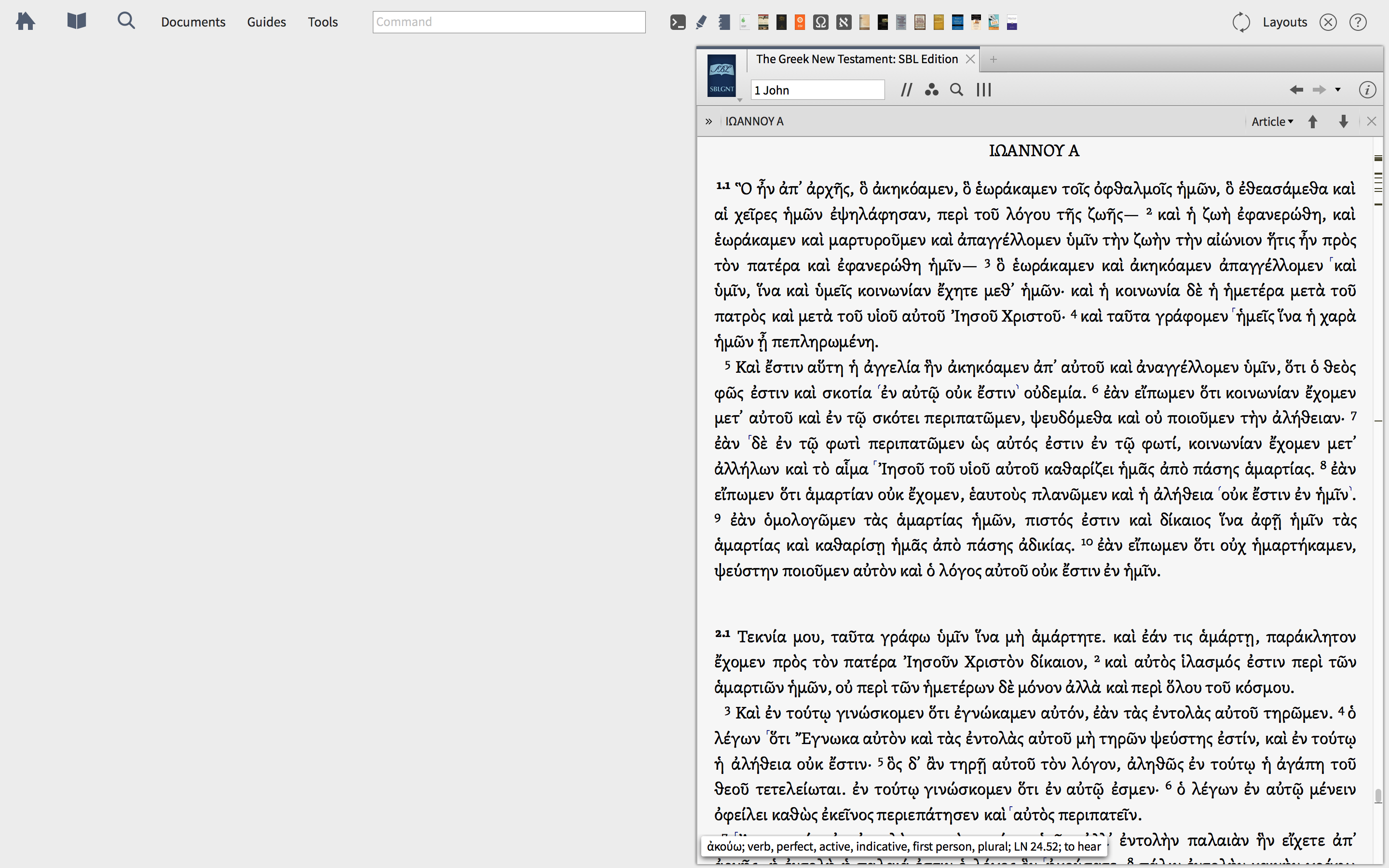 I am about to start translating 1 John for my Greek 2 class, and I need a Greek NT that is simple and clean. I decided to use SBL's. Nonetheless, even after I unchecked all the features at the visual filters, it still parses and labels the word at the bottom of the page for me (see image).