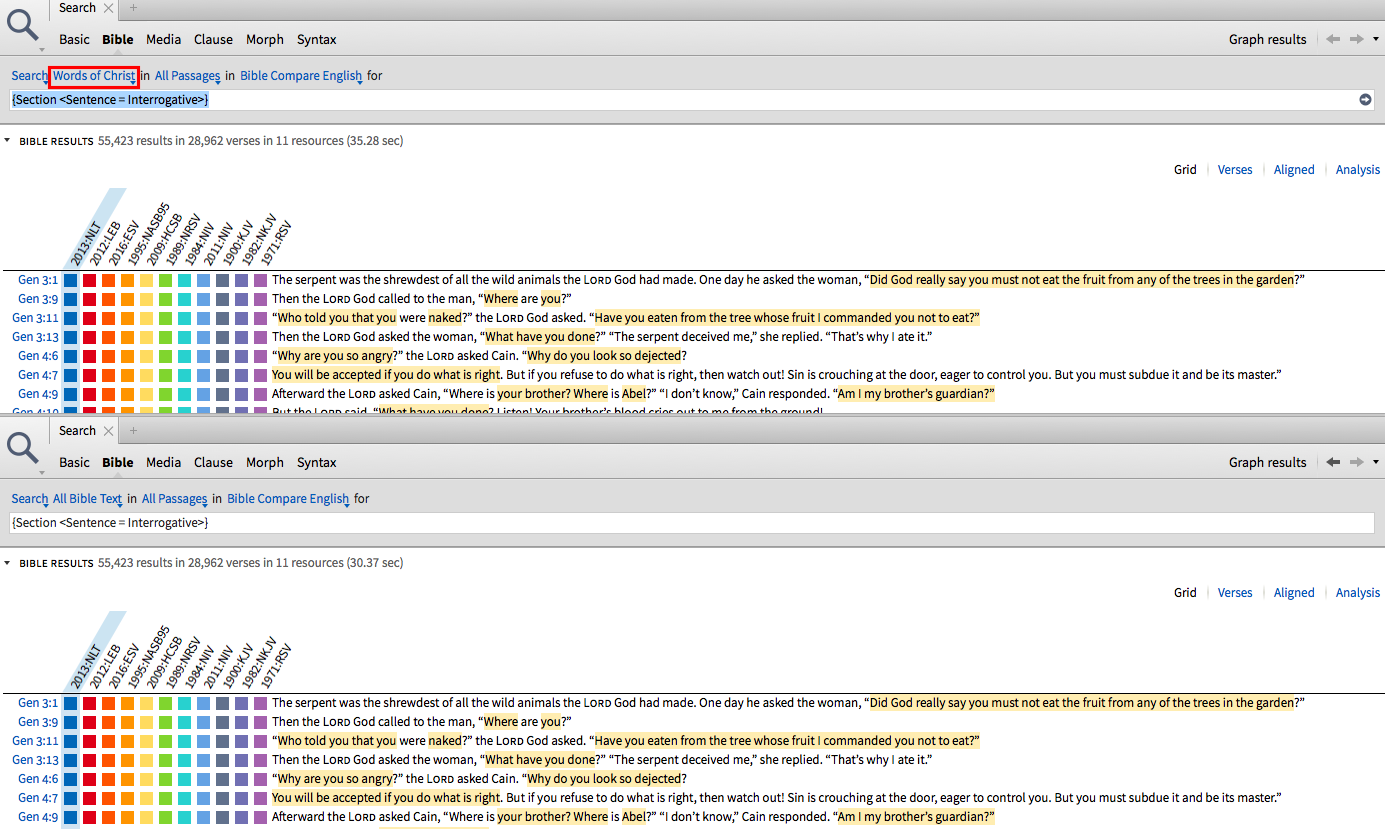 Search results for All Bible Text is the same as Words of Christ for interrogative sentences. Hence created this Bug thread with screen shot from Logos 7.12 Beta 3 on macOS 10.12.6