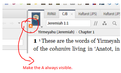 Hello friends. I guess would be useful if we could see in a glance what resources are linked. Now, only when you click the resource tag you realize if it is linked to other. May be using color sets, or make the letter set visible even if it is not selected the resource. For example, CJB (below) is linked to Haftarot (JPS), but can't note this if you don't click Haftarot (JPS). Regards.