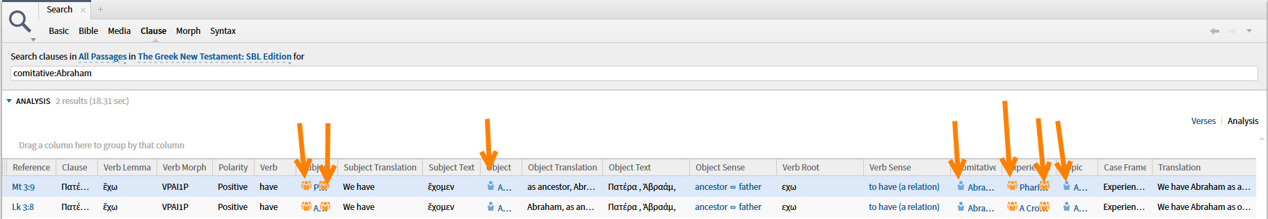 I like icons (orange arrows) as much as most people but I like enough text that I can read/guess it even more. Please give me the ability to hide all the icons in the analysis view of the clause search results ... or tell me that they shouldn't be showing and you'll fix it.