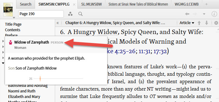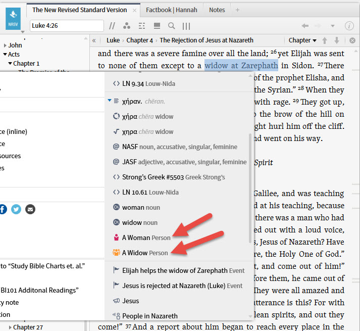 The context menu here shows only the generic woman/widow entries for Luke 4:25-26
