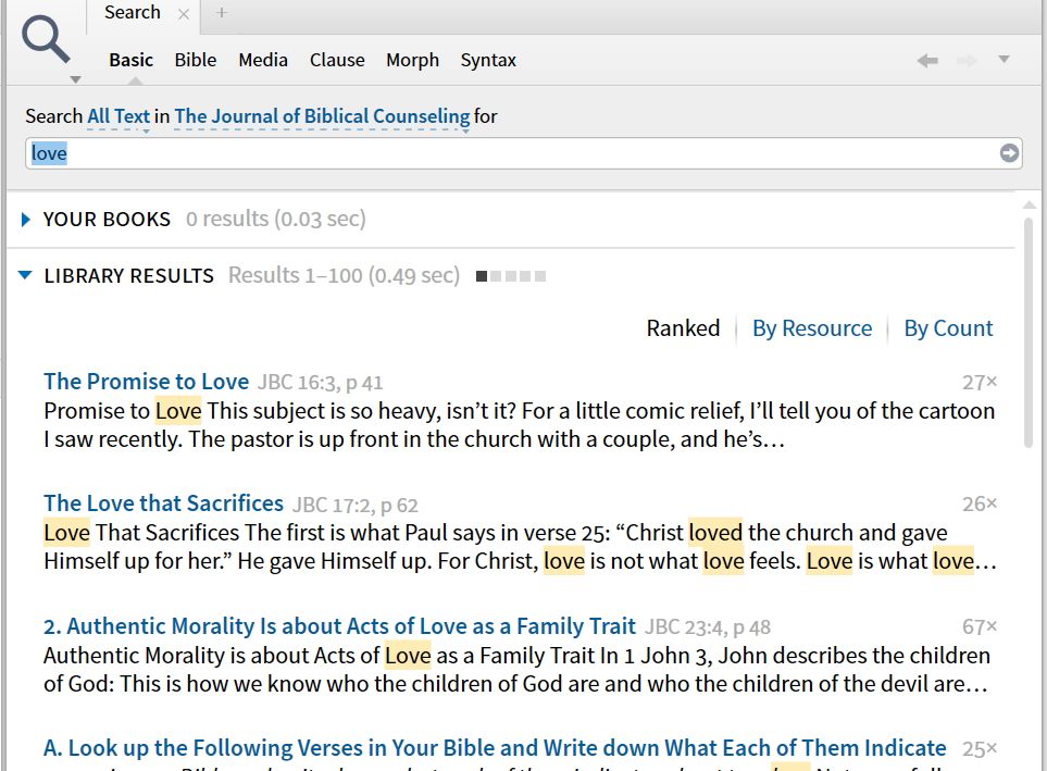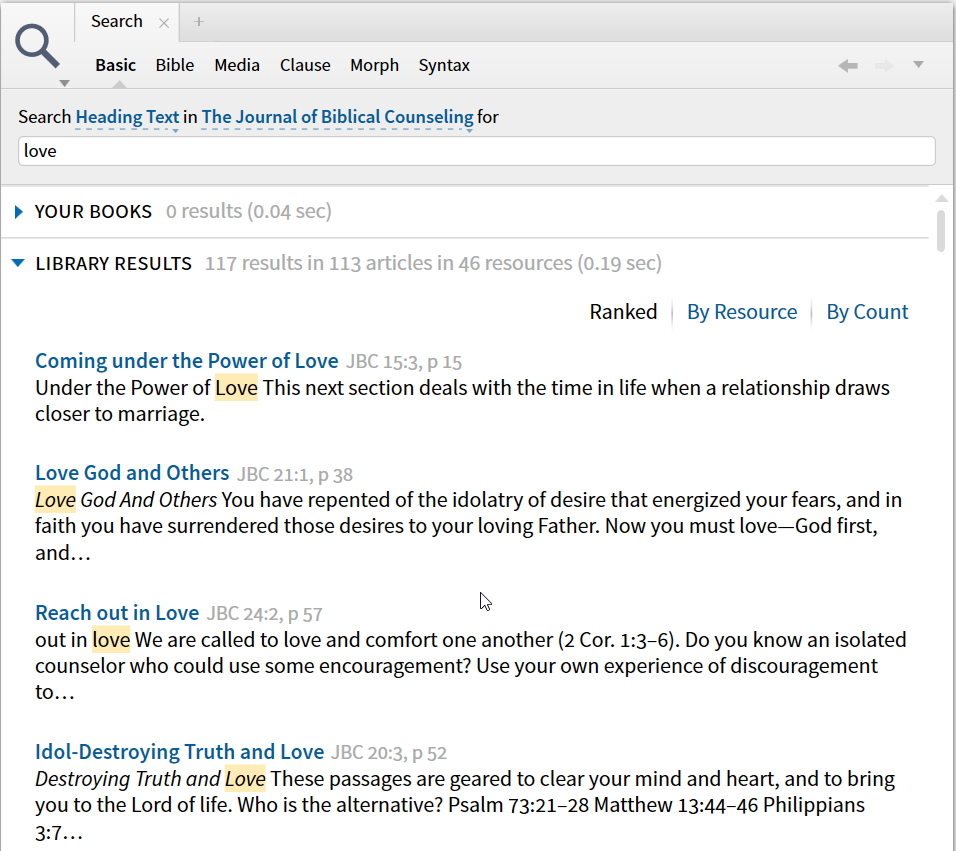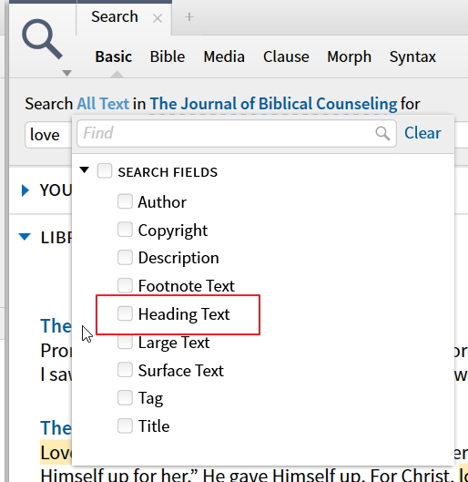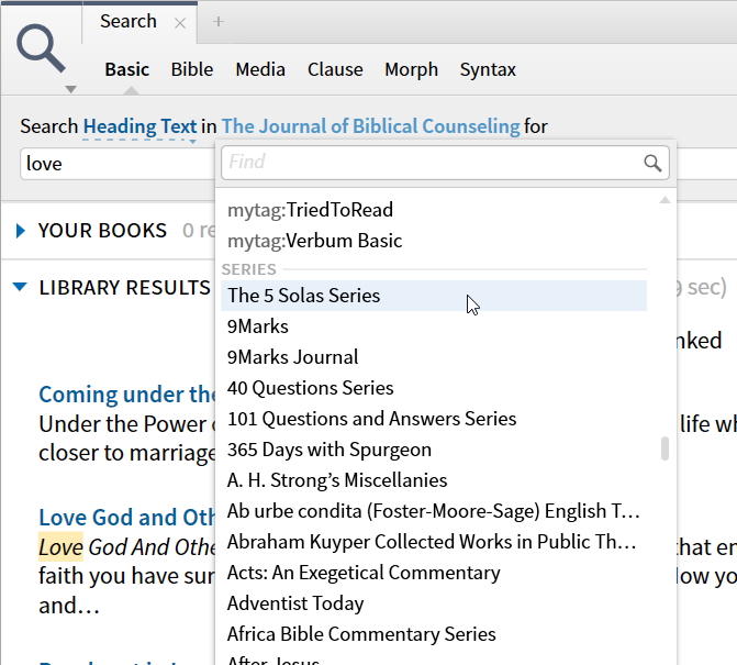 Find "The Journal of Biblical Counseling" here and select it. Any searches you do in this window will now just search those resources.