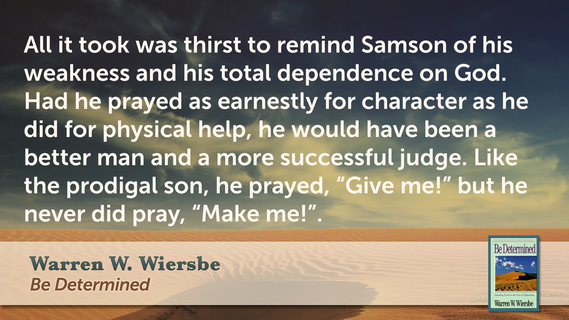 All it took was thirst to remind Samson of his weakness and his total dependence on God. Had he prayed as earnestly for character as he did for physical help, he would have been a better man and a more successful judge. Like the prodigal son, he prayed, “Give me!” but he never did pray, “Make me!” (Luke 15:12, 19).