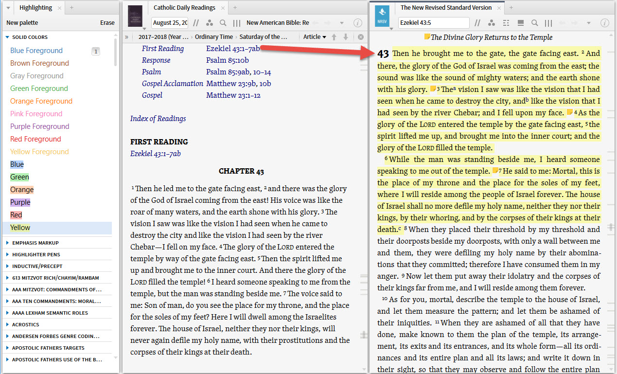 I would appreciate it if when opening a lectionary layout (QuickStart or Home Page) the pericope was highlighted in the Bible(s) which are opened by the layout.I have illustrated this with yellow highlight below but would prefer a solid light gray, for example. I would expect the highlighting to include entire verses and ignore gaps i.e. Ezekiel 43:1-7, Psalm 85:9-14 etc. This would make it easier to see where to start and stop the reading to correspond to the lection.