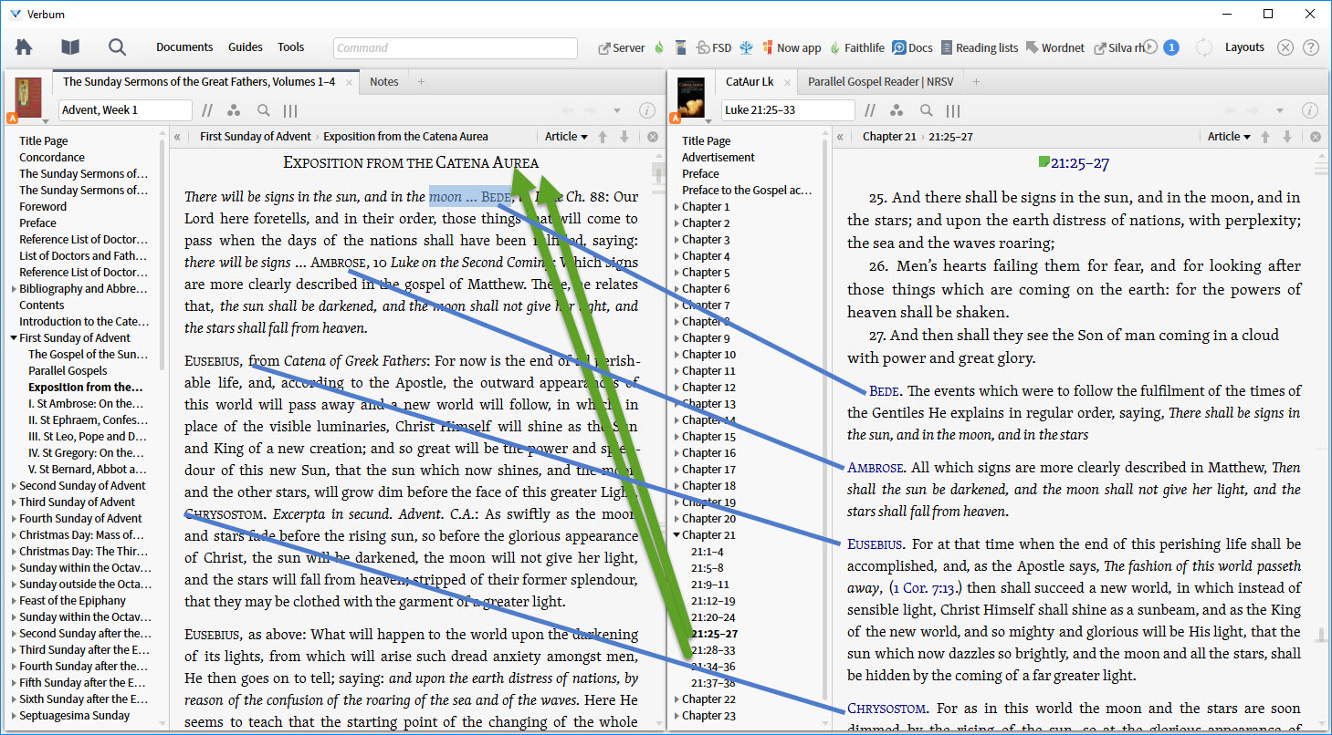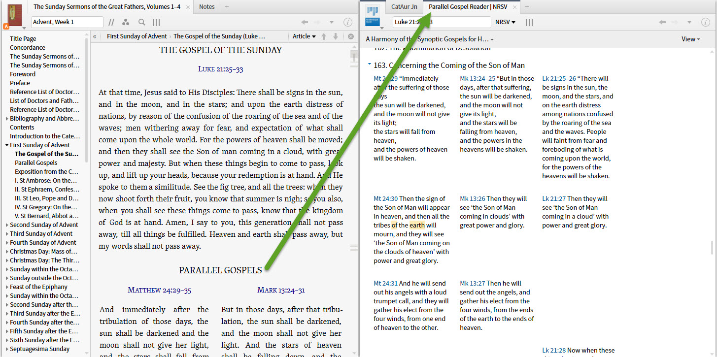 There are resources such as Toal, M. F., ed. The Sunday Sermons of the Great Fathers. Translated by M. F. Toal. Vol. 1–4. San Francisco: Ignatius Press, 2000. which include parallel passages - in this case limited to the Gospels. If would be helpful to be able to bring up the Parallel Gospel Reader from the Context Menu to see the parallels in their best format for comparison. I would not mind a mechanism similar to Community Tags which puts the onus of tagging on the users. Why? Because it would allow us to also tag the extract from the Caterna Aurea to its source in Aquinas.