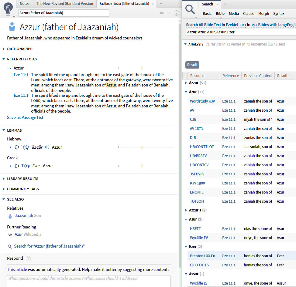 I was trying to add a Community Tag to a headword in a listing of "all the people in the Bible". Neither in the Information panel nor in the drop-down list for Community Tags had Azur. A bit of research showed that while KJV and D-R have "Azur", Faithlife uses the much more common spelling "Azzur" (54 to 12 in my English Bibles). So I tried to find all the spellings used in English Bibles:
