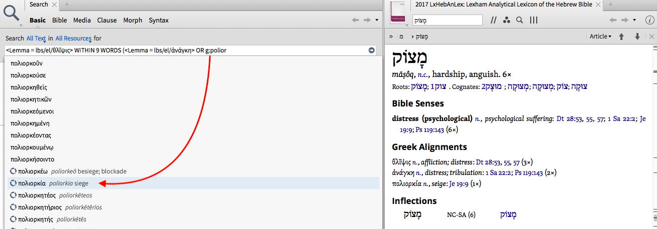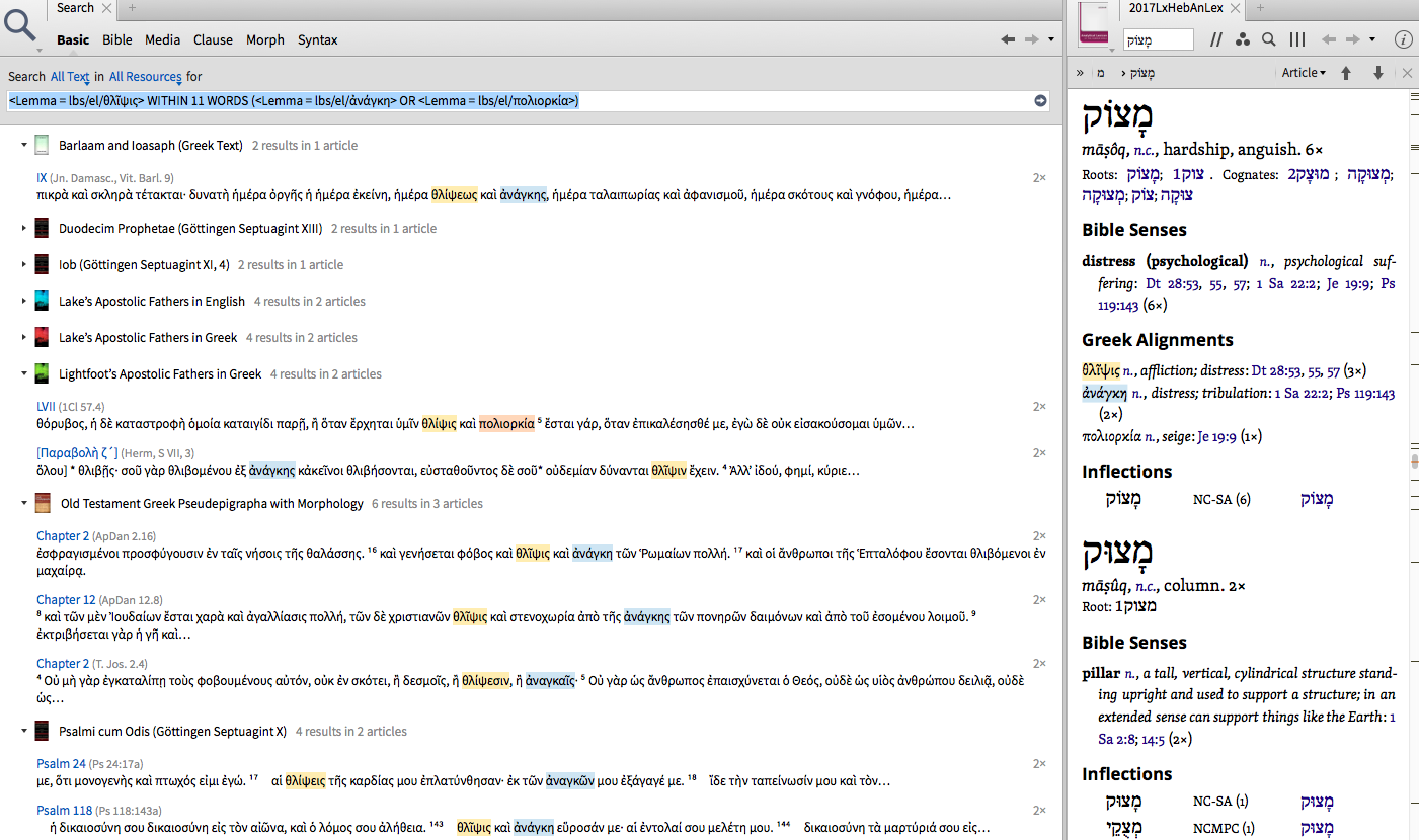 I'm trying to configure a search that will find every occurrence of the two lemmas θλῖψις and ἀνάγκη together in the same passage or verse throughout my entire library (I have many Greek resources, including the OT Pseudepigrapha, Apostolic Fathers, etc.).