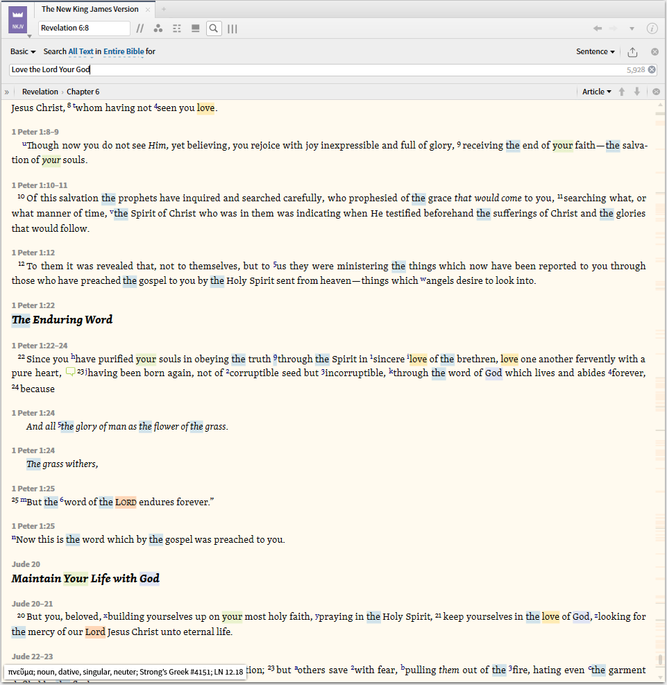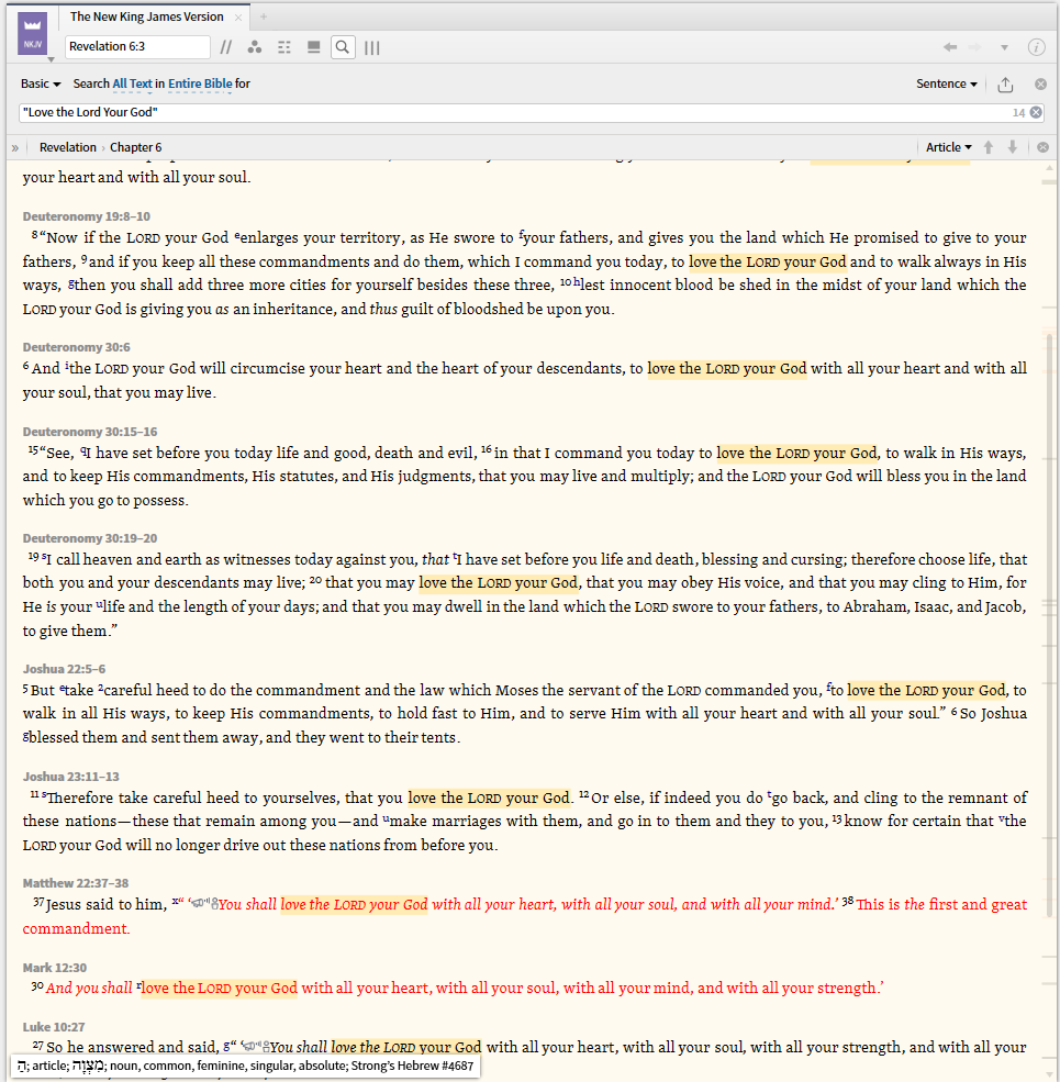 So I went and did a search for, "Love the Lord your God" that gave me 5,928 possible matches. Here are two examples on the first one the word "the" is highlighted twice in John 11:37. In verse 36the word "the" and "Loved" were highlighted.