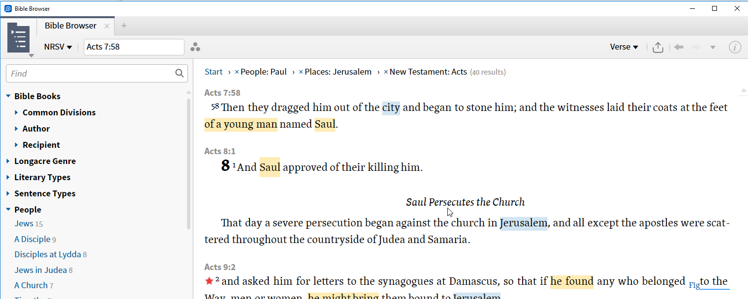 I have done the following search: <Person Paul> <Place Jerusalem> in the range of Acts (Bible search).