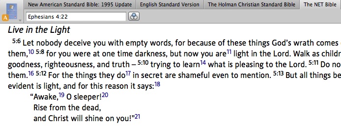 For example, I am working in Eph 4 now, so I have the NET Bible open to Eph 4:22: