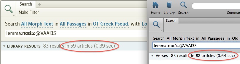 Being interested in creation I did a morphological search today, first on the Mac, then crosschecking in the windwos version. The results were similar, but not quite. I was search the OT Pseudepigrapha and found in both cases the same number of occurrences, but in a different number of »articles«. I include a screenshot.
