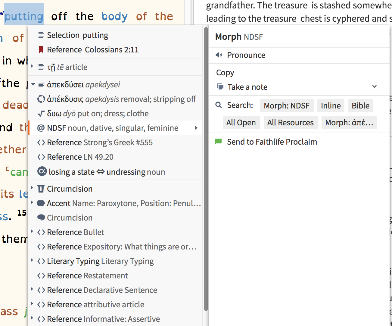 Since you are working on the Context Menu, I was wondering if you could add definitions to Greek and Hebrew morphology within the context menu? This would be extremely helpful for those who are still learning the original languages (and those who are rusty). It could be on hover or whatever.
