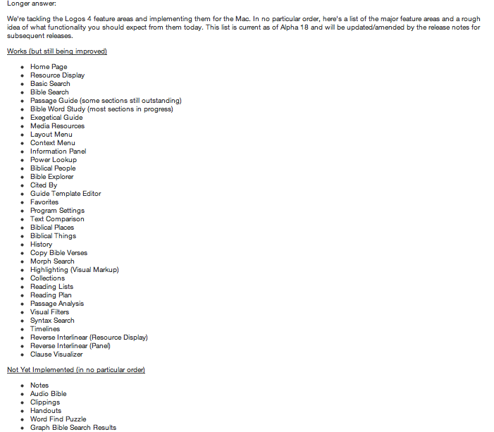 This list of implemented features was last updated on Alpha 18, can anyone update it so I can see clearly what is left to implement? Does it transition to beta once everything is at least partially implemented? If this is true I would think that we are only 2 or 3 alphas away from beta.