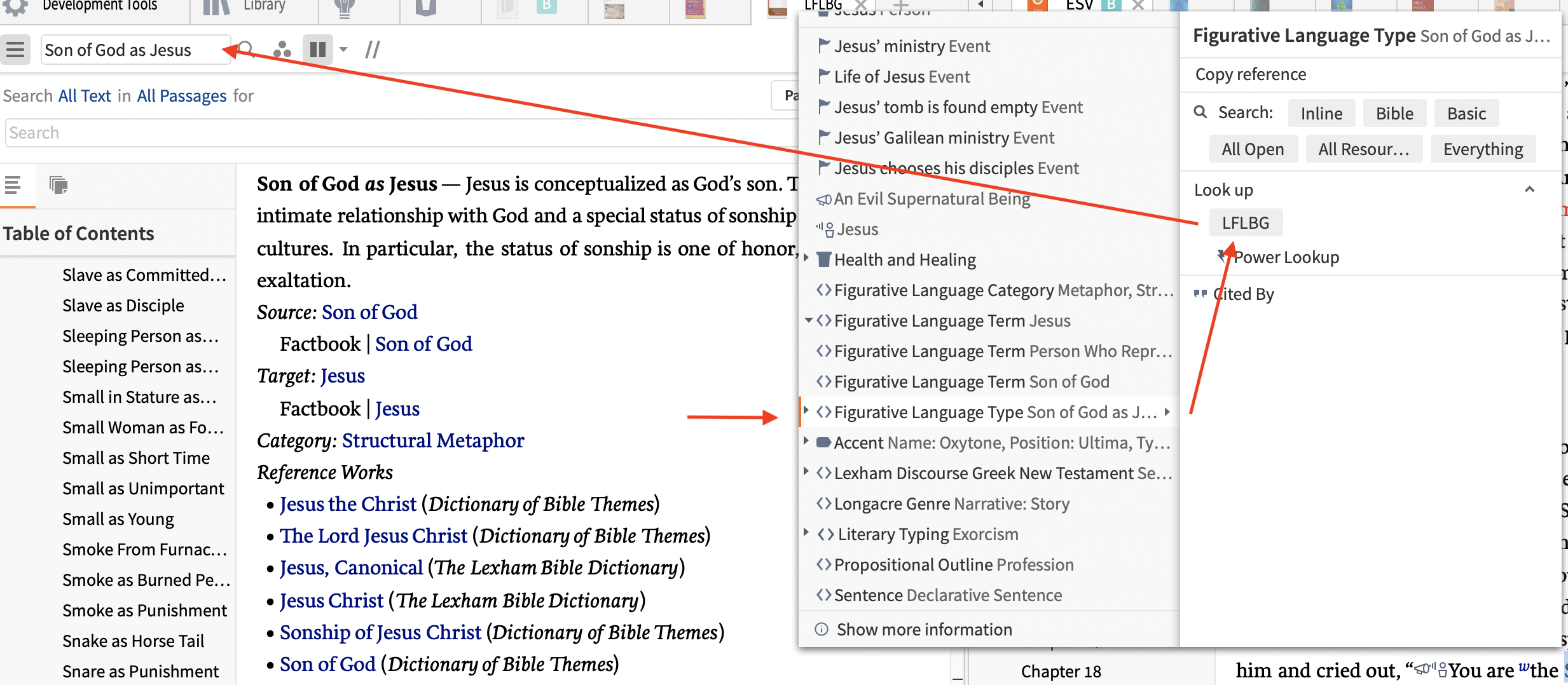 2. I would expect there to be a path between the "Son of God as Jesus" in the label and the resources given in the documentation. Based upon the behavior of the rest of the system, I would expect Factbook to contain an entry for the type "Son of God as Jesus" - no such entry. Based on expediency, I would expect a link on the right hand side of the context menu to the documentation.