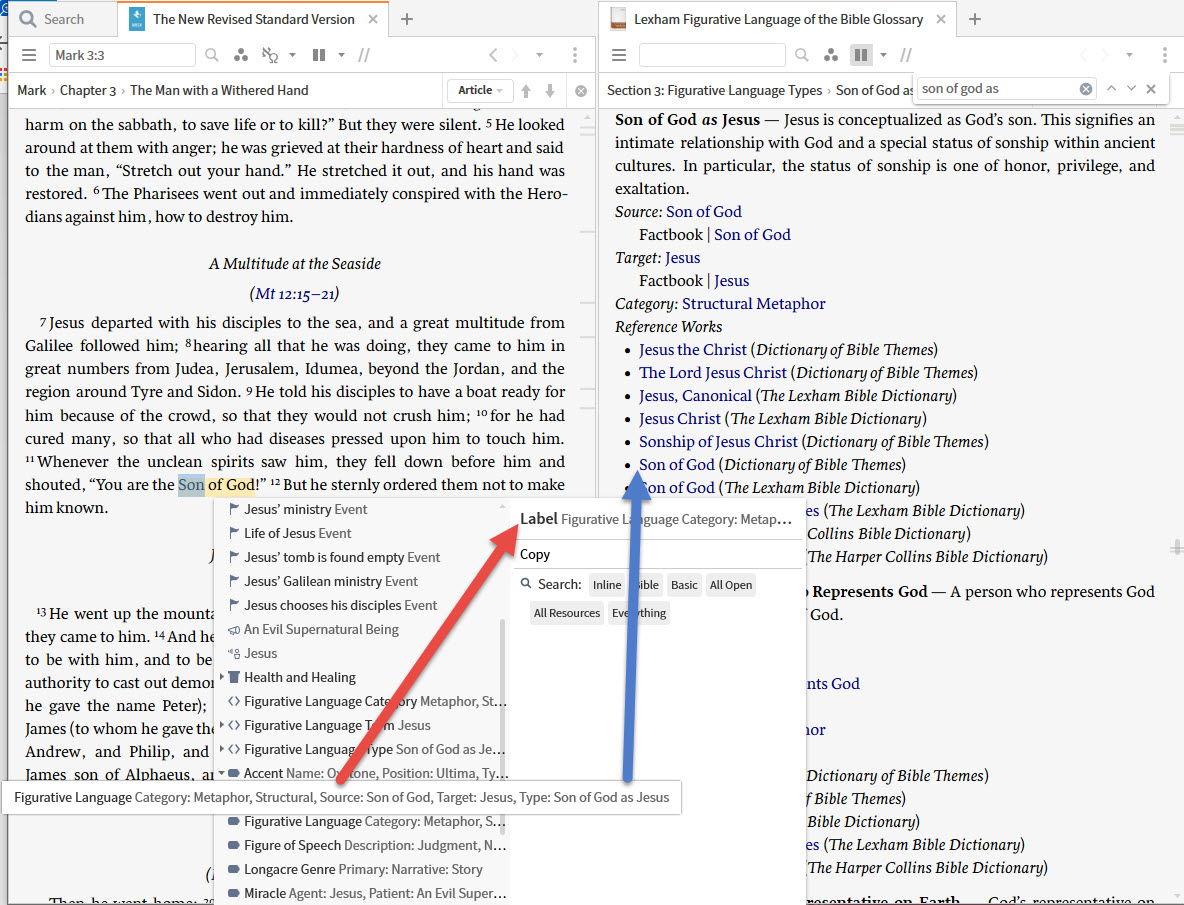 Westbury, Joshua R., Jeremy Thompson, Kristopher A. Lyle, and Jimmy Parks, eds. Lexham Figurative Language of the Bible Glossary. Bellingham, WA: Lexham Press, 2016. Color me naive but from the documentation, I expected some kind of link from the tagging to the references. So here are my first two disappointments which may be bugs: