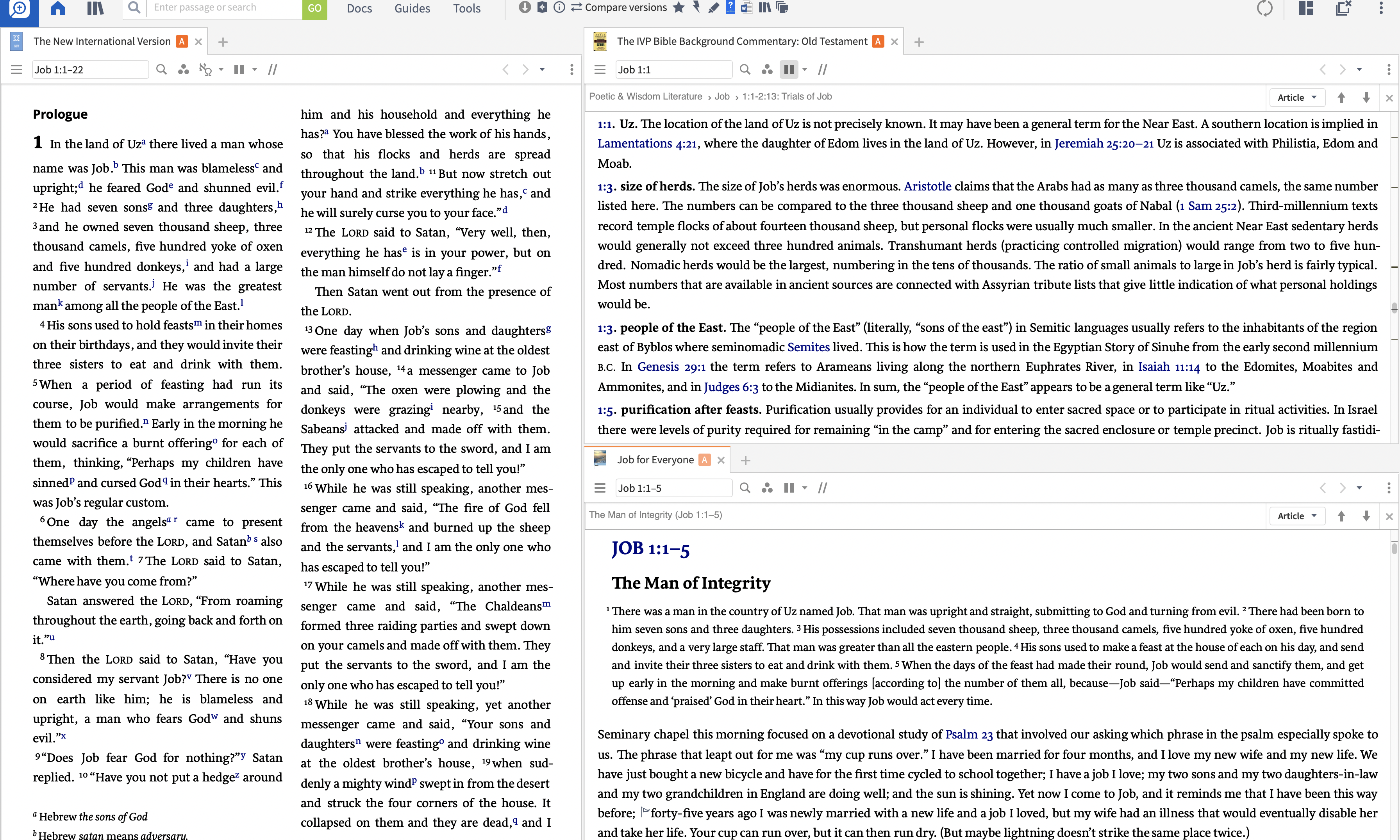 I am looking for a resource that will assist me in my daily Bible reading. In my devotional reading time I read through the Bible one book at a time. Currently I am reading in the book of Job. What I am looking for is a resource that I can read that will follow along with the chapters in the Bible that I am reading. I am allowing about an hour for this, with my Bible reading taking about 15 minutes or so, that leaves about 45 minutes of background reading. I am thinking maybe a survey, introduction, one volume commentary or perhaps a series of lesson guides. Is anyone doing something similar? Do you have any suggestions for possible resources? Thanks!