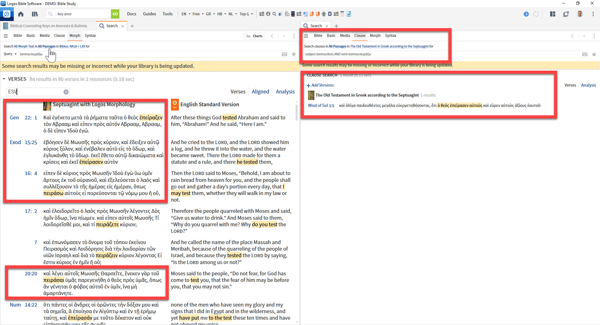 Why are the passages Gen. 22:1, Ex. 15:25, 16:4 and 20:20 (see left side of the screenshot) and others not included in the clause search on the right?